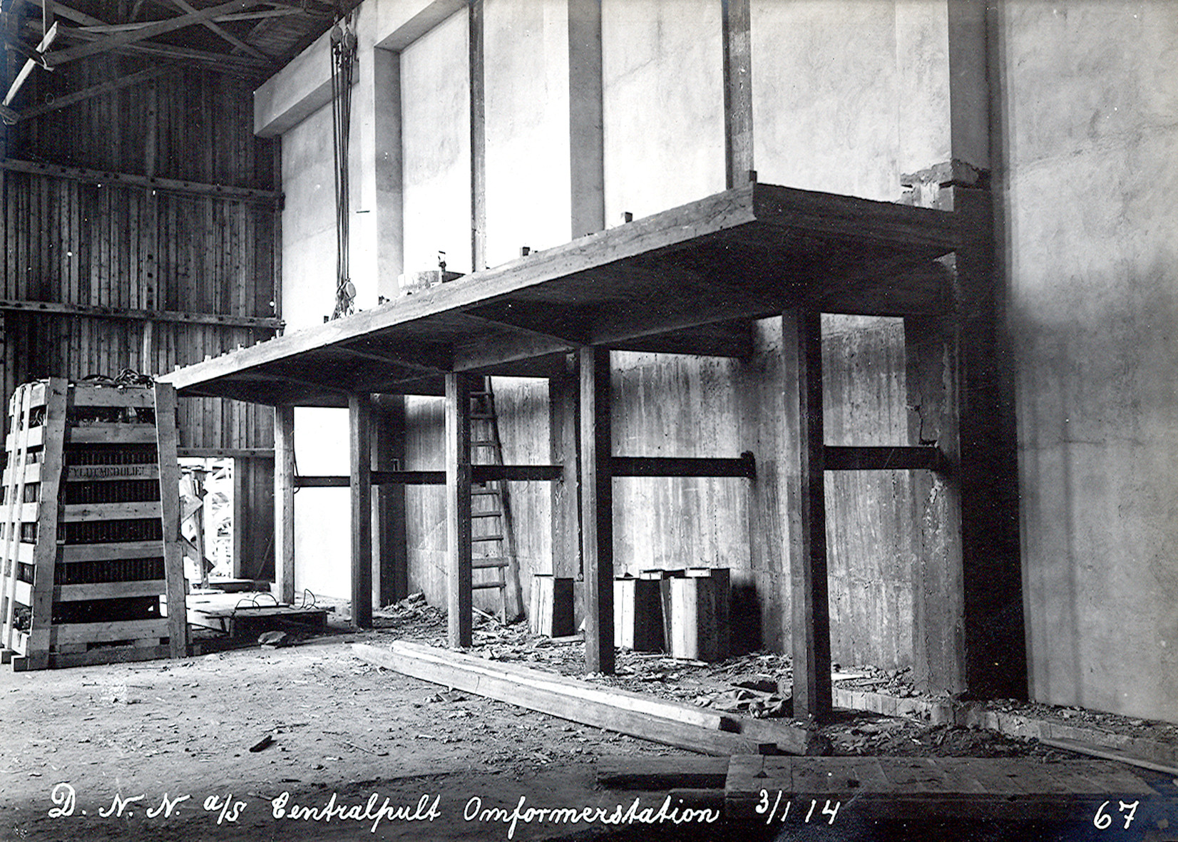 Nitriden. ”Interiør” i omformerstasjonen. 1. byggetrinn. Foto: Løvfold, 25.10.1913. Stort bilde