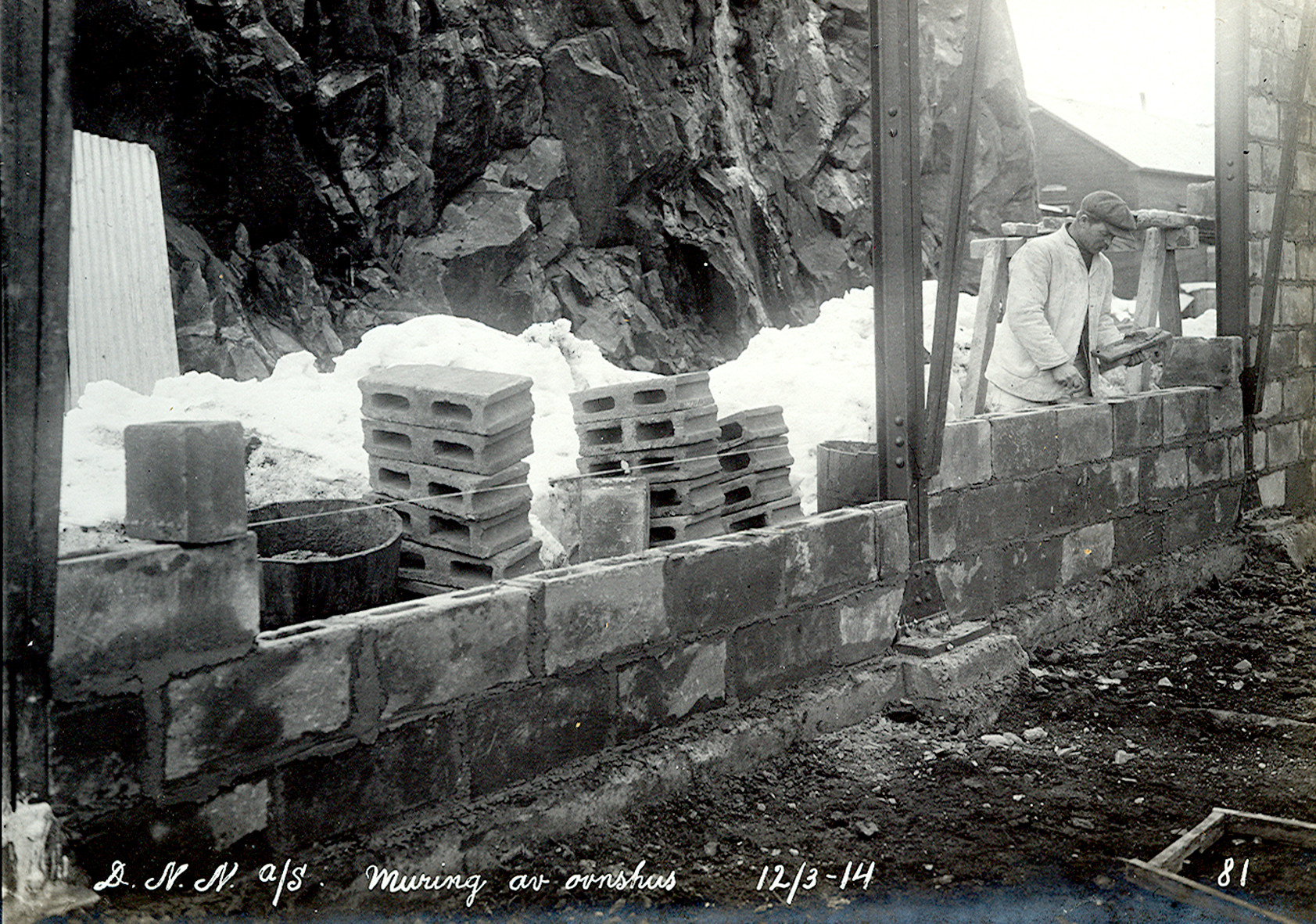 Nitriden. Muring av vegger i ovnshus. Sementblokker. Foto: Løvfold, 12.3.1914. Stort bilde
