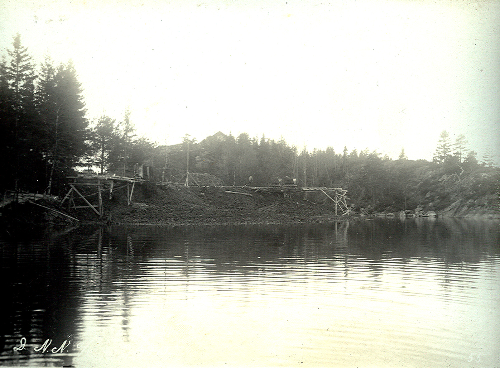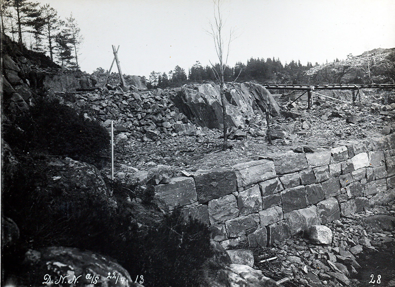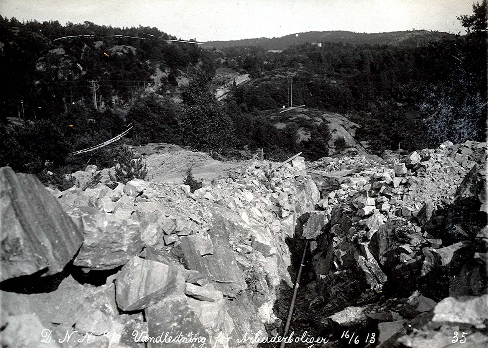 Nitriden. Ser ut til å være en ”tipp” for overflødige masser i Heggedalsbukten. Foto tatt mot vest. Høydebassenget sees på toppen av høyden. Foto: Løvfold, 1913. Stort bilde