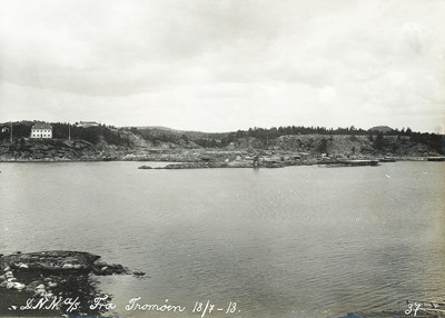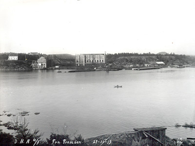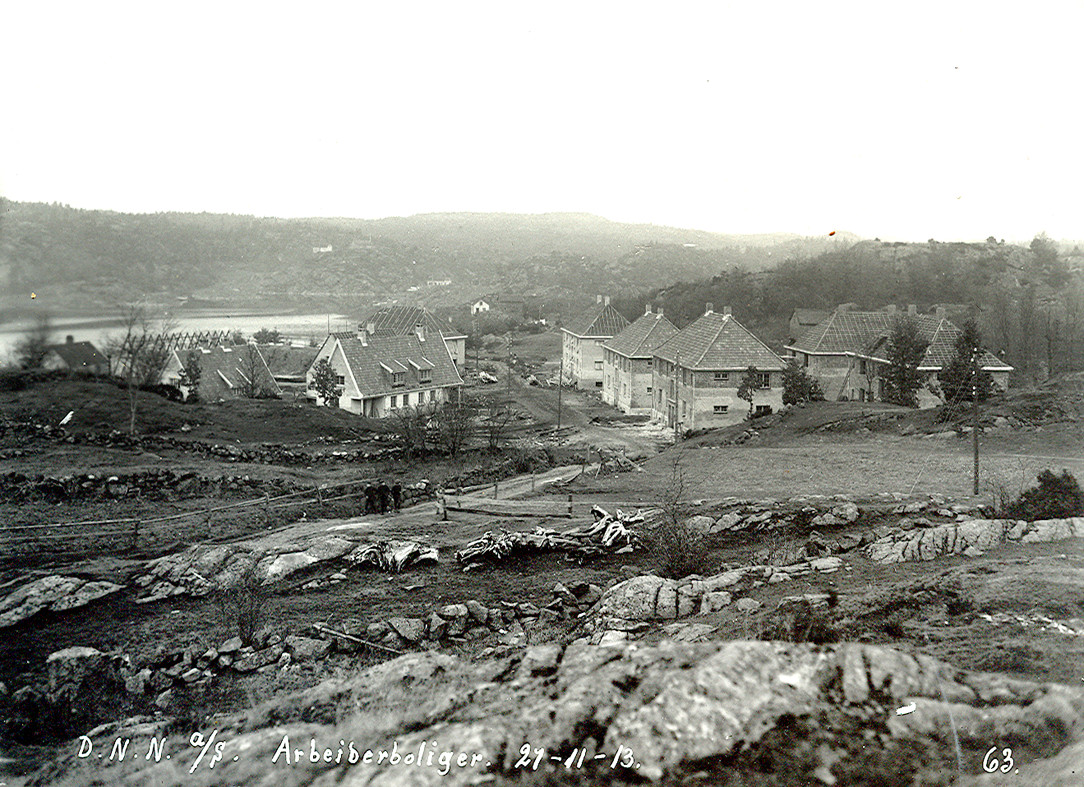 Nitridens fabrikkanlegg (tomter) sett fra Tromøya. Det hvite to-etasjes huset er direktørbolig for Smelteverket. Høydebassenget sees på toppen til høyre. Kai til høyre. Fabrikktomtens planering. Planeringen på høyden til høyre var tenkt til svovelsyrefabrikken, som ikke ble noe av. Midt på bildet sees en fyrlykt, satt opp på et skjær i 1894, men ble flyttet til Friisøy i 1929. Lykt nr. 612 i Norsk Fyrliste. Foto: Løvfold, 18.7.1913. Stort bilde
