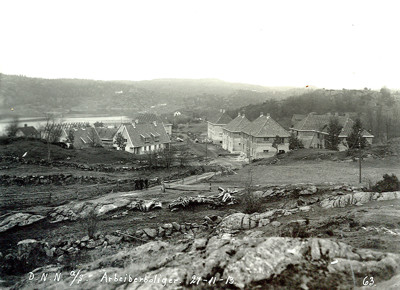 Nitriden. Grunnarbeider for Elektrodefabrikken. Arbeidsbrakker i bakgrunnen. Foto: Løvfold, 27.11.1913. Stort bilde