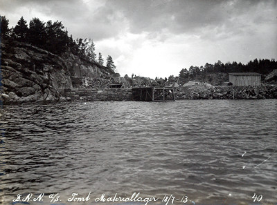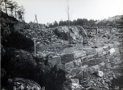 Nitriden. Planering av tomt. Mur mot sjøen ved materiallageret. Foto: Løvfold, 22.4.1913. Stort bilde
