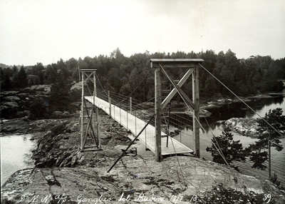 Nitriden. Gangbru fra Langnes (Pinnen) til Buøy. Kun tillatt adgang for dem som bodde på Buøy. Brua var så høy at marinens båter kunne passere under. Trekonstruksjon. Foto: Løvfold, 18.7.1913. Stort bilde