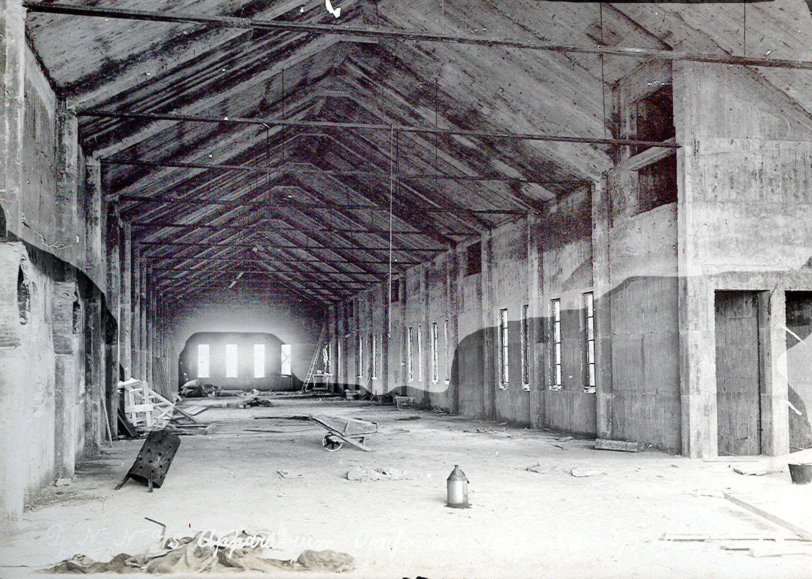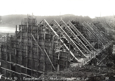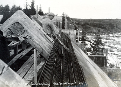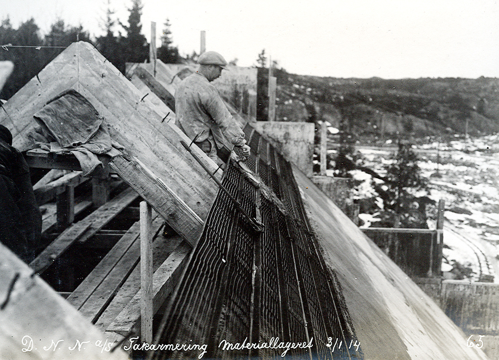 Nitriden. Materiallageret ete. Armering av tak. Foto: Løvfold, 3.1.1914. Stort bilde
