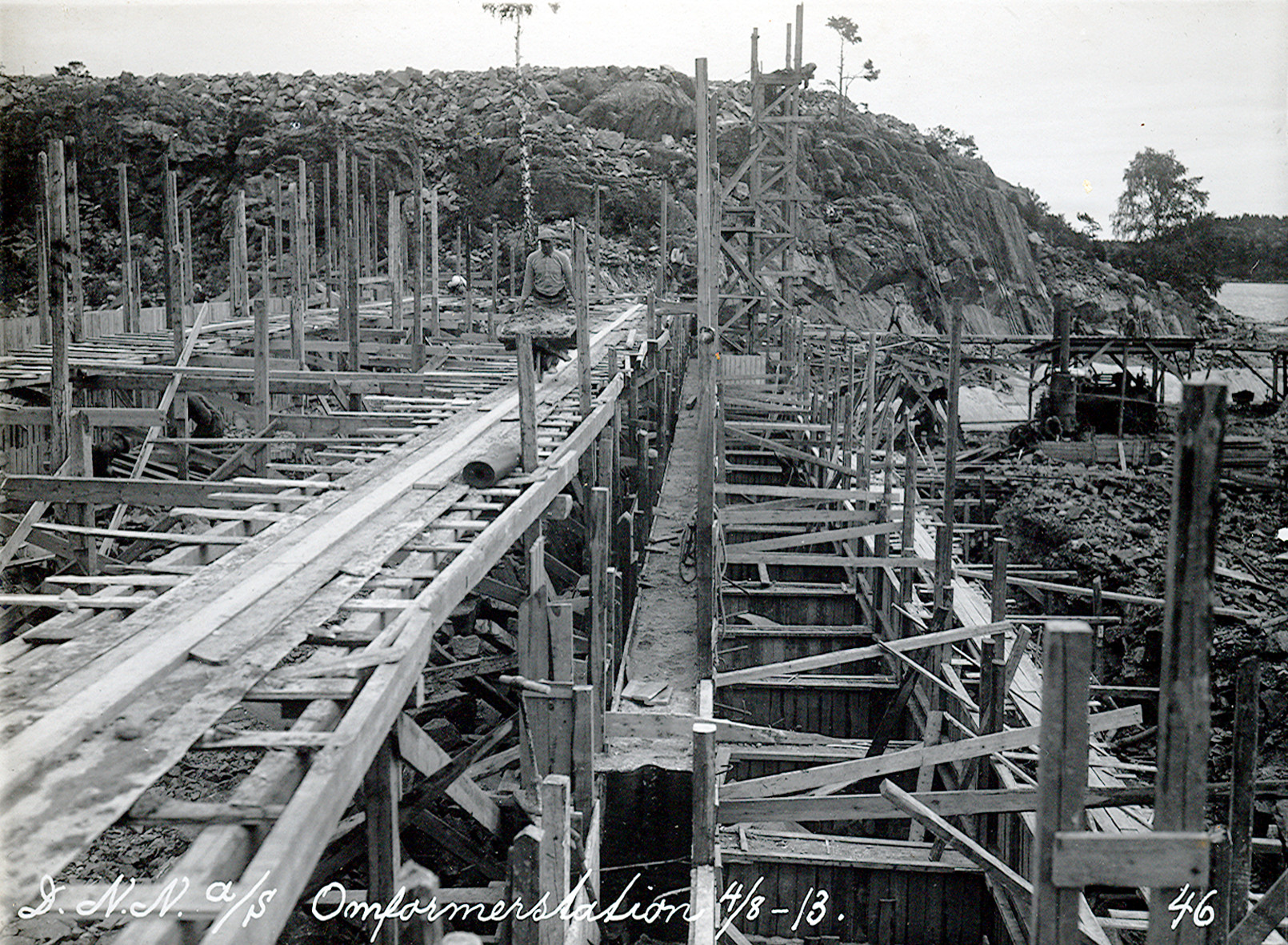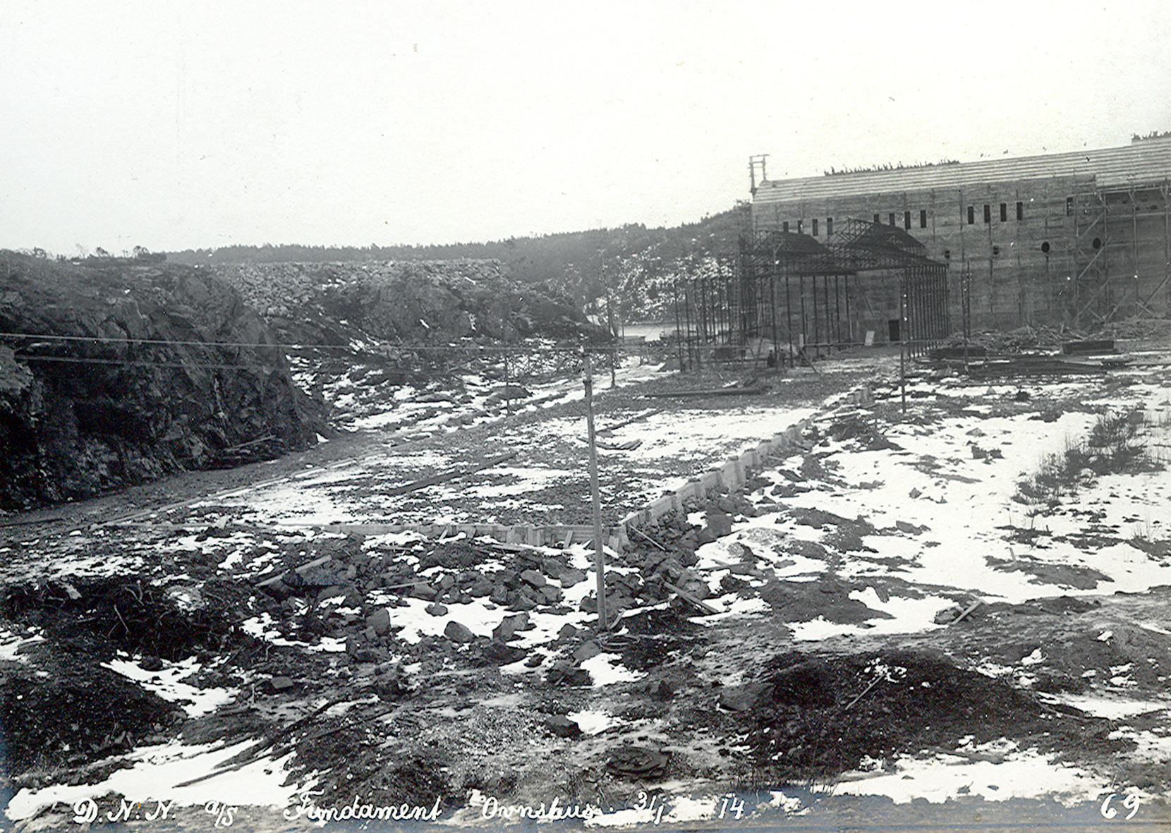 Nitriden. Omformerstasjonen. Grunnarbeider. Støping. 1. byggetrinn. Høyden i bakgrunnen planert tomt for svovelsyrefabrikken. Foto: Løvfold, 4.8.1913. Stort bilde
