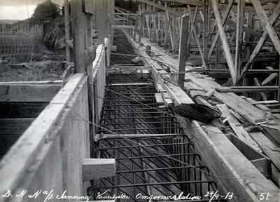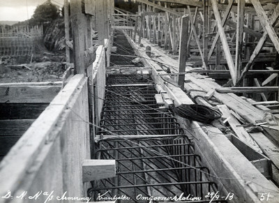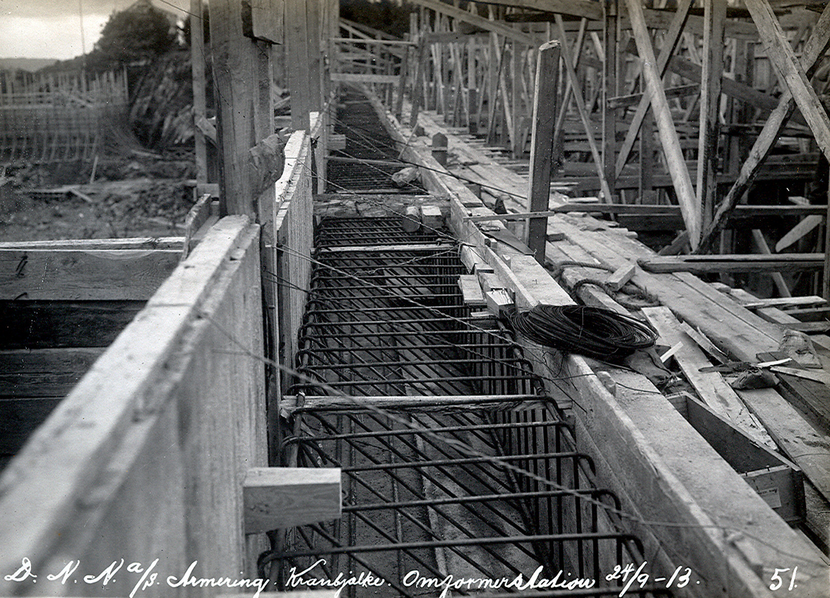 Nitriden. Omformerstasjonen. 1. byggetrinn. Armering for kranbjelke. Til venstre pågår byggearbeide for materiallager, administrasjonskontorer, snekker og mekanisk verksted. Foto: Løvfold, 24.9.1913. Stort bilde