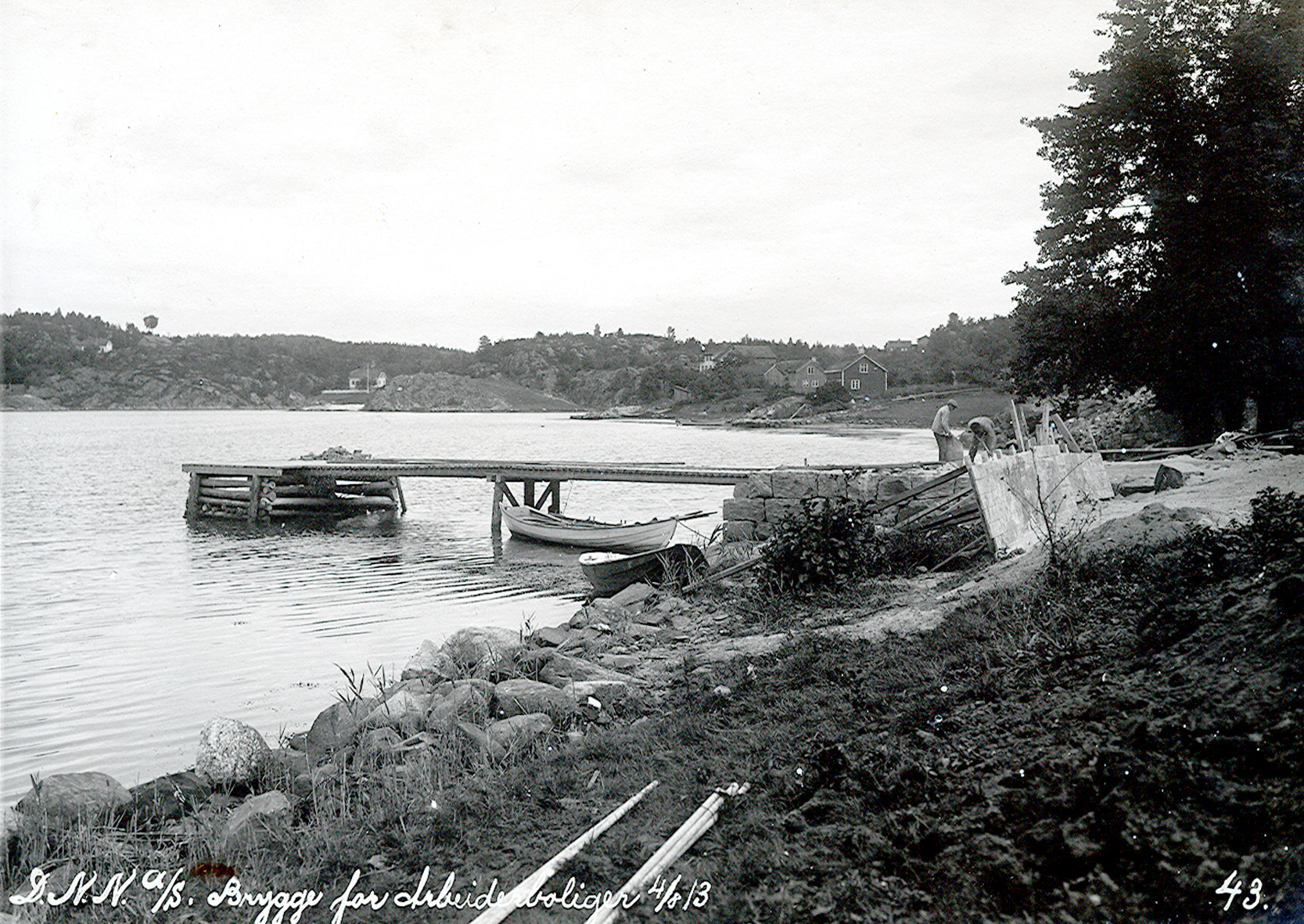 Eydehavn. Brygge for arbeiderboliger i Neskilen. Nesgaten ligger oppe til høyre. I bakgrunnen kom senere Folkets Hus, Neskil bru og etter hvert Moland Rådhus. Ved denne brygga regnes også med at det meste av byggematerialet til arbeiderboligene kom i land, og ble fraktet med hest og kjerre til byggeplassen. Foto: Løvfold, 4.8.1913. Stort bilde