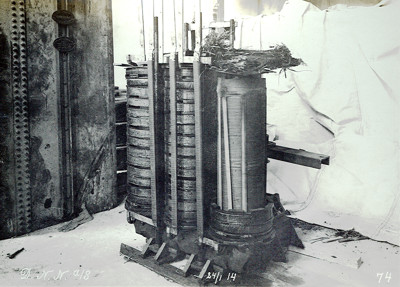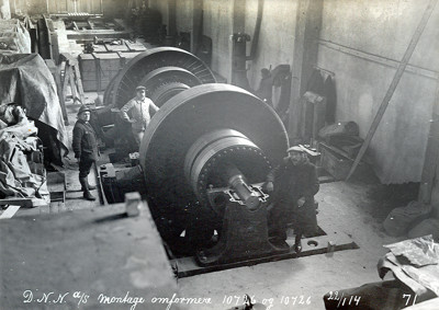 Nitriden. Montasje av omformere 10726 og 10726. Omfomer vekselstrøm til likestrøm. Likestrøm nødvendig for produksjon av aluminium. Foto: Løvfold, 22.1.1914. Stort bilde