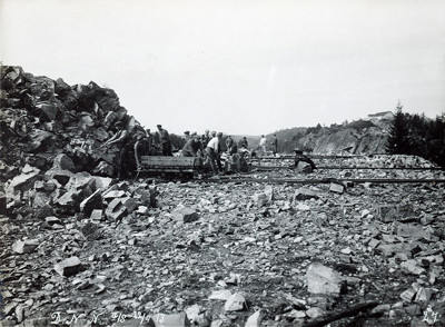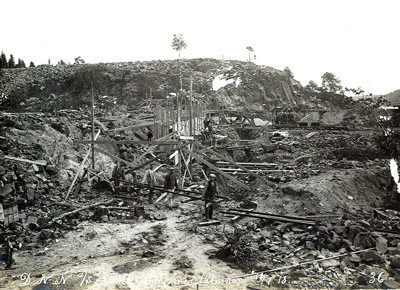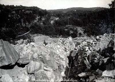 Nitriden. Planering tomt. Skinnegang for traller hvor utsprengte fjellmasser ble kjørt bort før planering. Vannbasseng pa høyden. Foto: Løvfold, 22.4.1913. Stort bilde