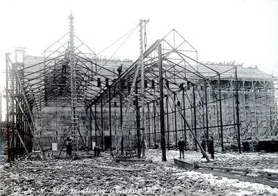 Nitriden. Montasje av stålkonstruksjoner ovnshus. Omformerstasjonen i bakgrunnen. Foto: Løvfold, 3.1.1914. Stort bilde