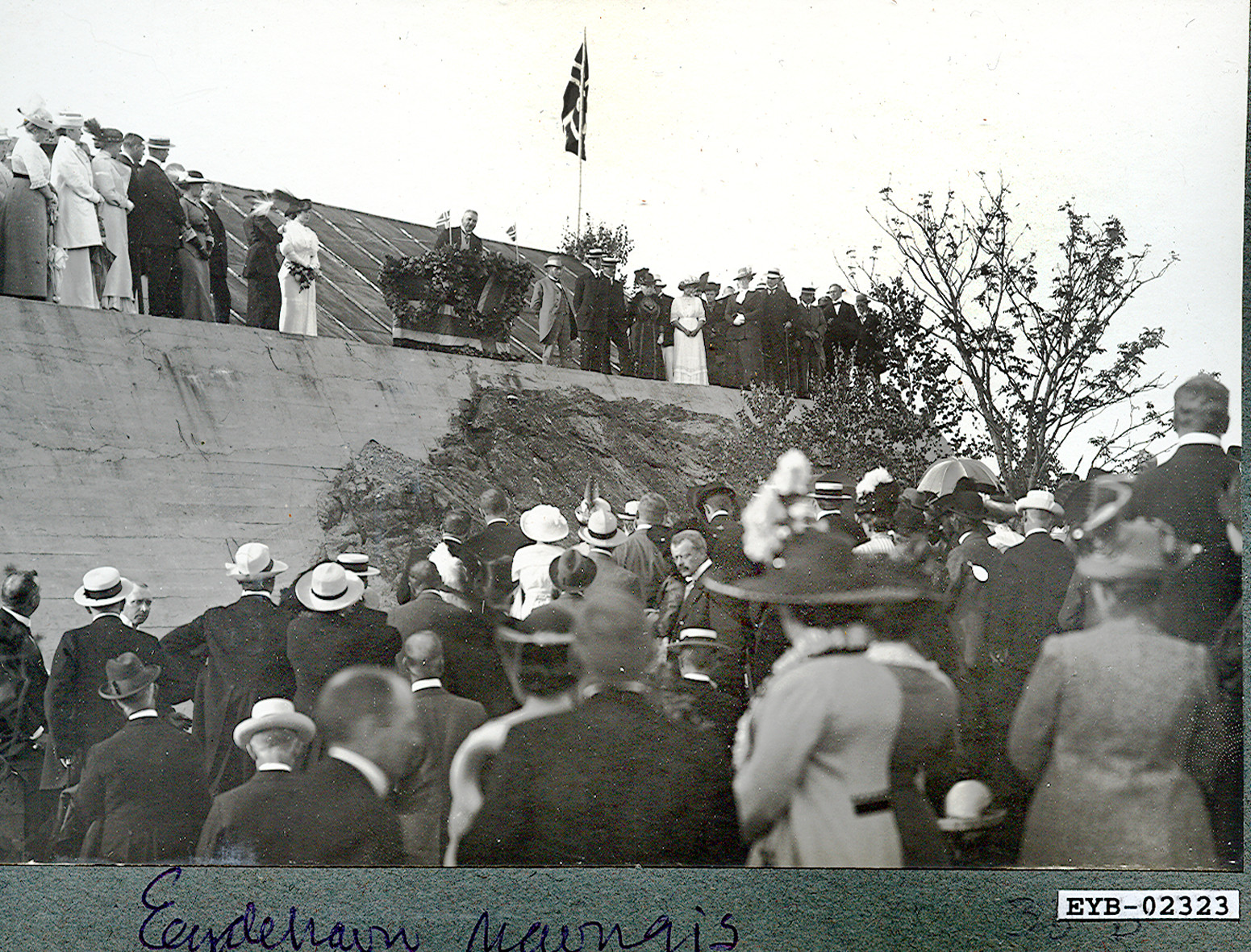 Eydehavn navngis. Stedet ble døpt på skipsmaner, ved knusing av champagneflaske i fjellet på den høyde mellom bedriftene som vannbassenget lå. Fru Elly Eyde foretok dåpen, og uttalte: ”Jeg døper hermed dette sted Eydehavn, og uttaler det håp at det vil bringe hell og fremgang til de bedrifter som her vil fremstå, og lykke og velsignelse for de mennesker som her skal bygge sine hjem”. På dette bildet står Sam Eyde på talerstolen. Fru Elly Eyde til venstre i hvit kjole. Foto: Løvfold, 12.7.1913. Stort bilde