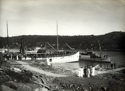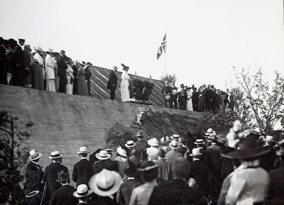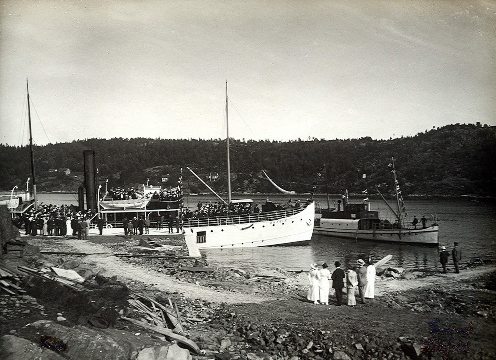 En lang rekke representanter for offentlig og privat virksomhet var møtt frem, bl.a. amtmannen i Nedenes, Sven Aarrestad, minister N.C.Prebensen, ordføreren i Arendal, Han Schrøder, ledelsen for stedets industribedrifter, representanter for kraftleverandøren. Medlemmene av Norges Rederforbund, som i de dagene holdt sitt generalmøte i Arendal, var også tilstede. Det møtte i alt 3-400 mennesker. Foto: Løvfold, 12.7.1913. Stort bilde