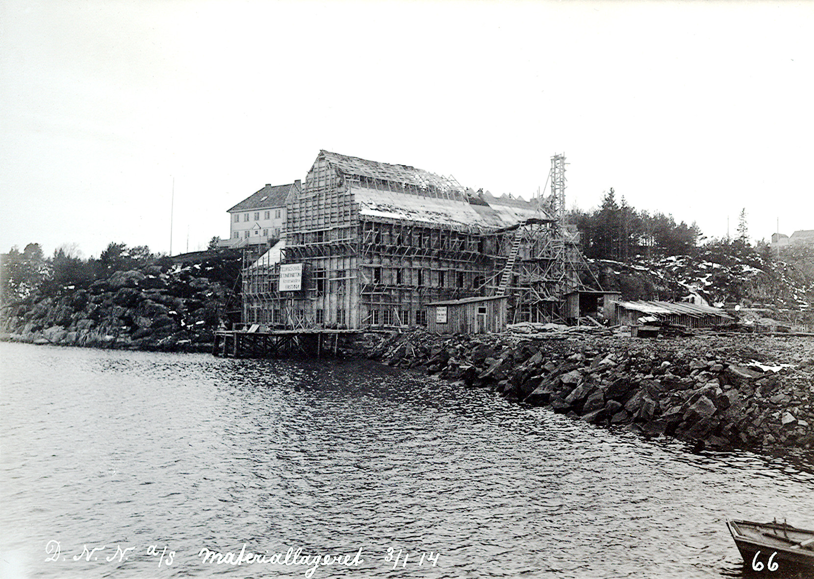Nitriden. Takkonstruksjon for materiallager. Tromøysund og Tromøy i bakgrunnen. Foto: Løvfold, 27.11.1913. Stort bilde