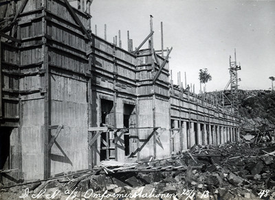 Nitriden, omformerstasjonen. 1. byggetrinn. 1. etasje ferdig støpt. Arbeide med 2. etasje i gang. Betongheis til høyre. Sett mot øst. Den planene høyden i bakgrunnen tomt for svovelsyrefabrikken. Foto: Løvfold, 25.8.1913. Stort bilde