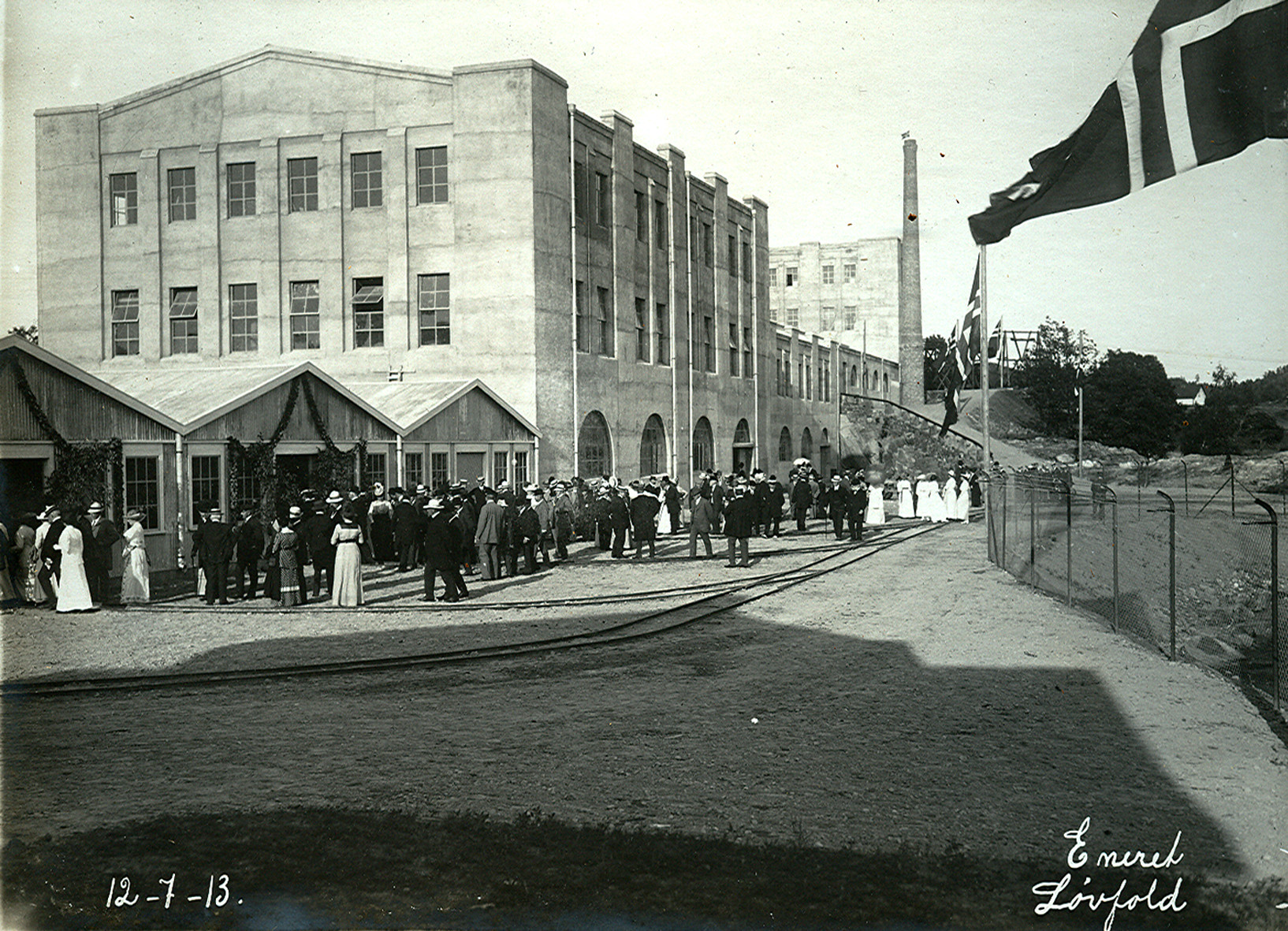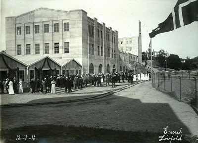 Smelteverket. Befaring av fabrikkanleggene i forbindelse med at stedet fikk navnet Eydehavn 12. juli 1913 og offisiell åpning av fabrikken. Det var pyntet med løvkranser og flagg. Etter ”dåpsseremonien” ble de besøkende vist rundt på det den gang ca. 5000 kvadratmeter store fabrikkanlegget. Bygningene i forgrunnen er Kjemisk vaskeri, og Pakkeri. Murbygningen er Malle II (finknusing av produktet), deretter Ovnshus II, Rørovnshus med skorstein og Malle I (grovknusing av råmaterialer). Foto: Løvfold, 12.7.1913. Stort bilde