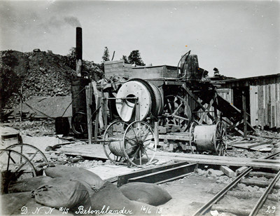 Nitriden. Dampmaskindrevet betongblander. Betongtraller med store hjul. Foto: Løvfold, 16.6.1913. Stort bilde