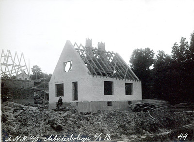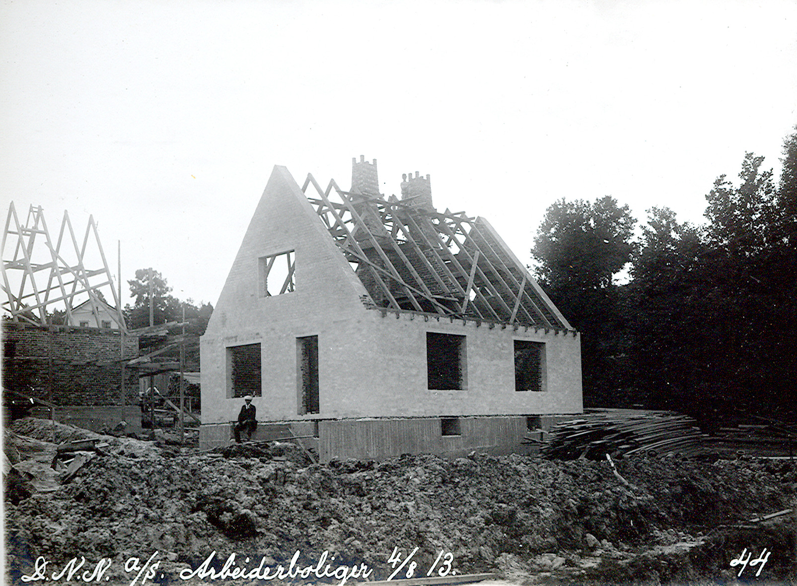Eydehavn. To-mannsboliger beregnet for formenn, i Nesgaten , Eydehavn, under arbeid. De øvrige bygningene ligger til venstre. Bakenfor reisverket til venstre skimtes Eydehavn Bedehus, bygd i 1906. Foto: Løvfold, 4.8.1913. Stort bilde