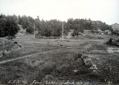 Nitriden. Tomt omformerstasjon. I bakgrunnen planert tomt for svovelsyrefabrikken som ikke ble noe av. Foto: Løvfold, 18.7.1913. Stort bilde