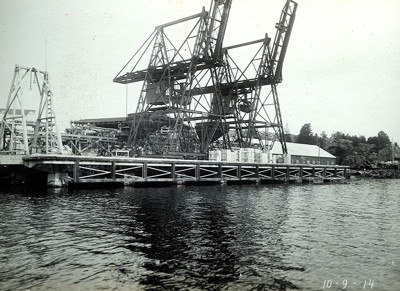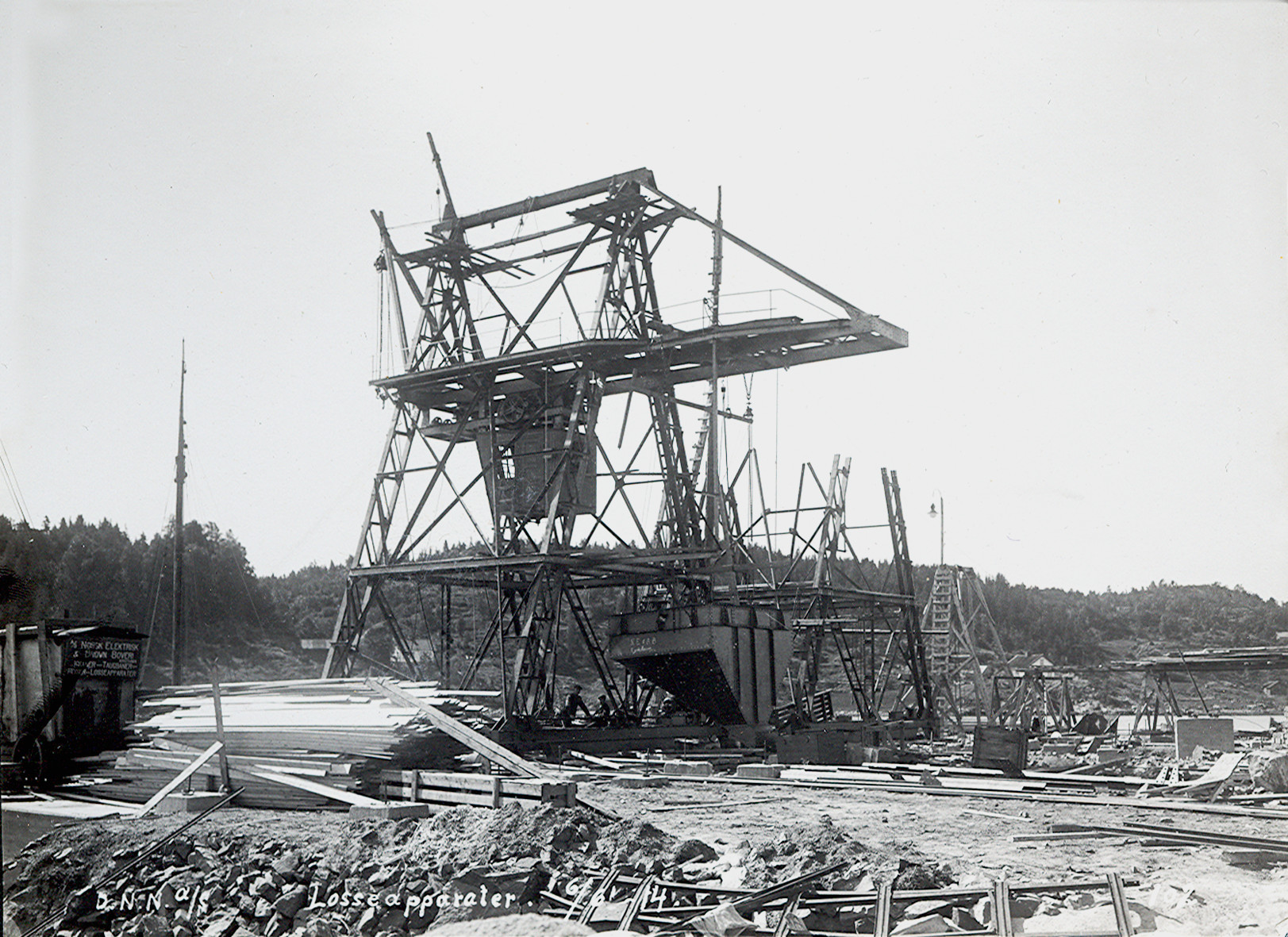 Nitriden. Losseapparat på kai ved Tromøysund. Stillaser og jernkonstruksjoner. Foto: Løvfold, 6.6.1914. Stort bilde