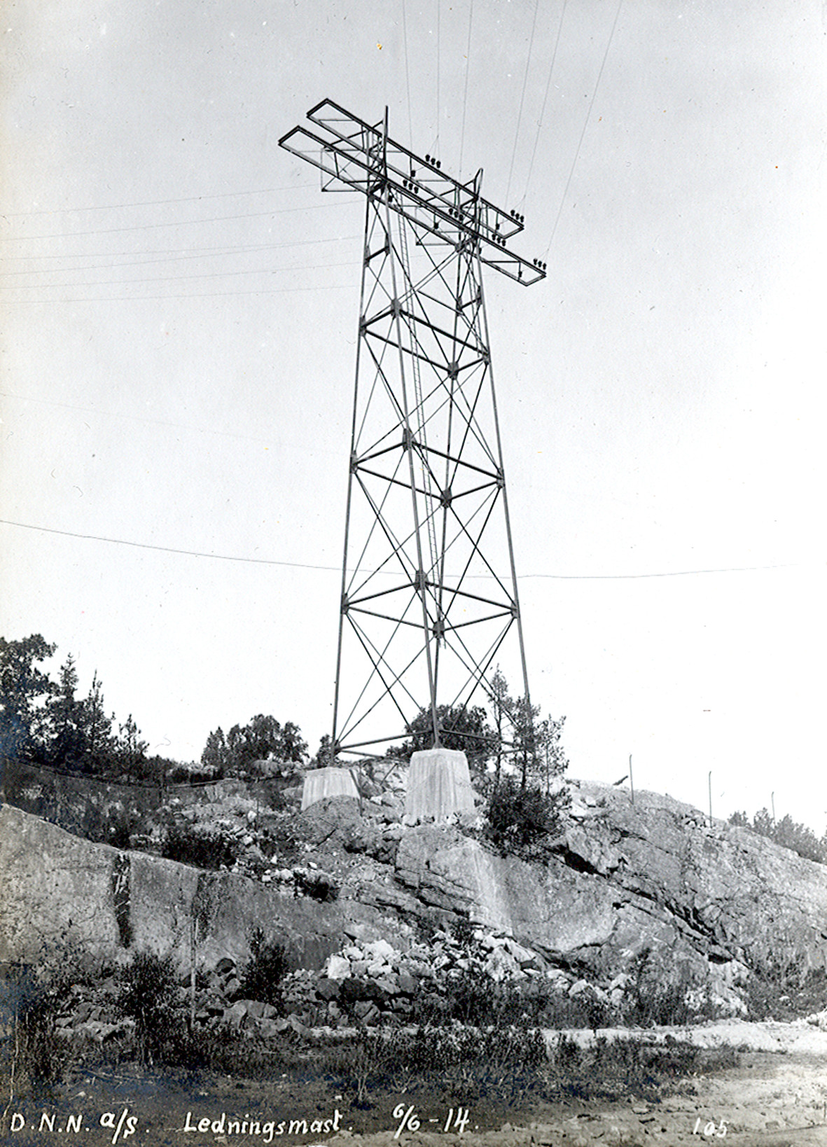 Nitriden. Høyspentmast øst for høydebassenget. Ledninger til veggfeste i omformerstasjonen. Foto: Løvfold, 6.6.1914. Stort bilde