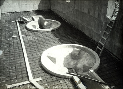 Nitriden. Elektrodefabrikken. Armering og fundament for gassgeneratorer. Foto: Løvfold, 30.5.1914. Stort bilde
