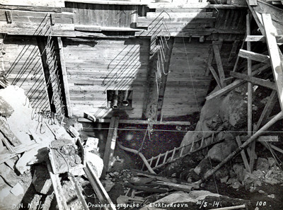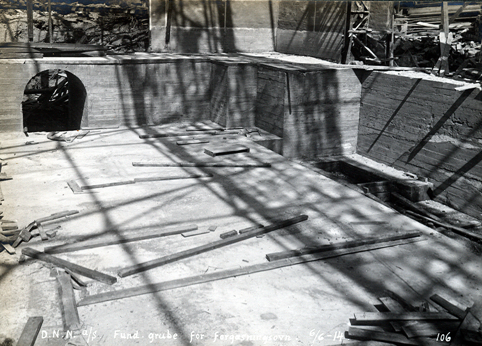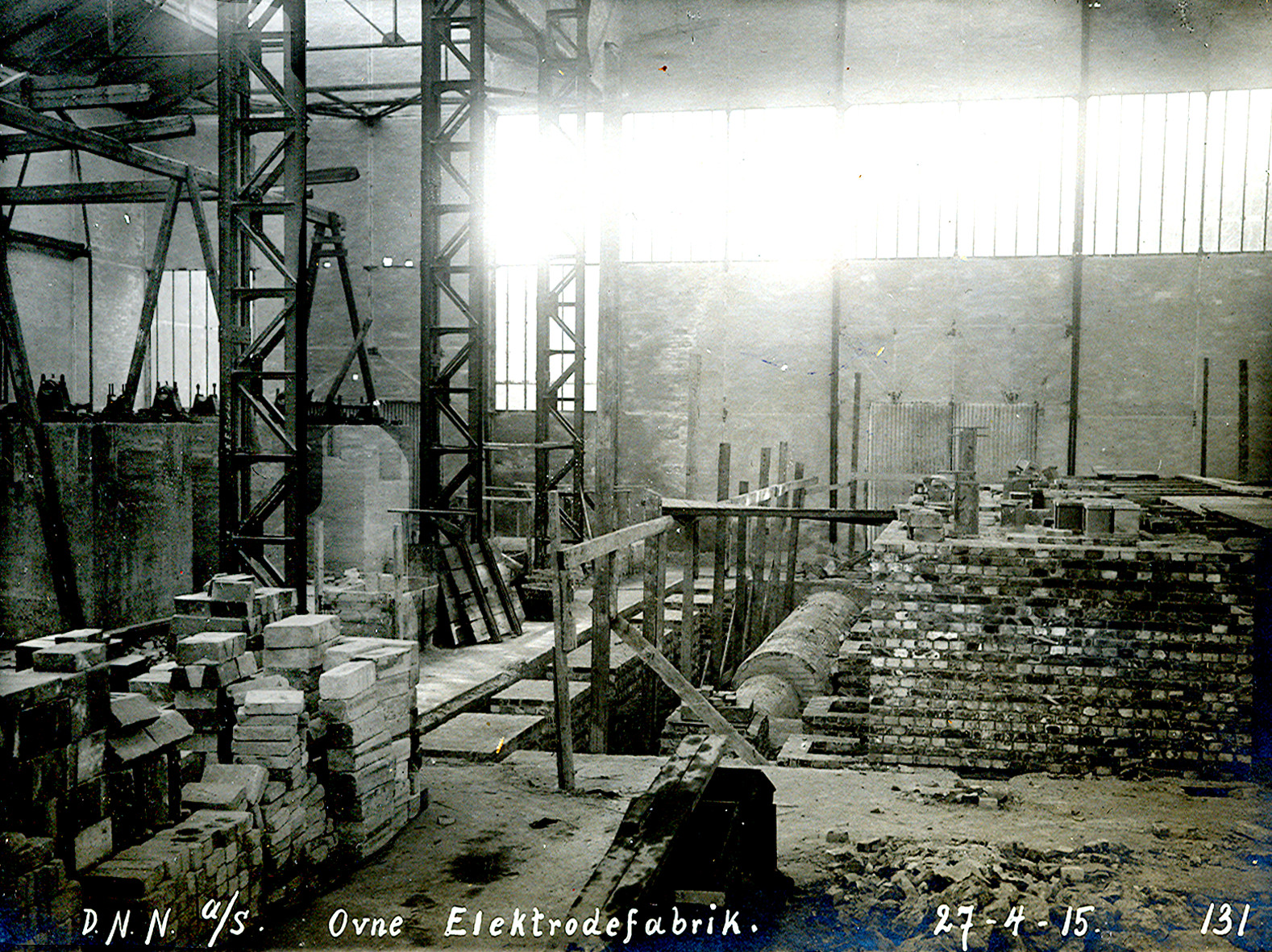 Nitriden. Elektrodefabrikken. Dreneringsgrop for elektrodeovn. Foto: Løvfold, 30.5.1914. Stort bilde