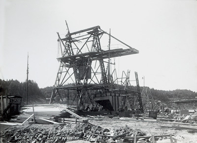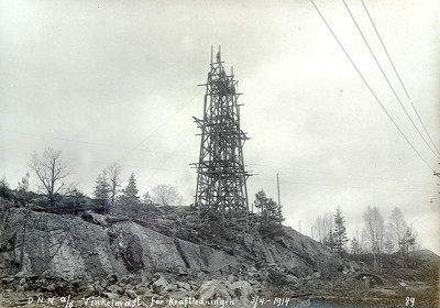 Nitriden. Høyspentmast. Stillas og jernkonstruksjoner. Øst for høydebassenget. For kraftledninger fra Bøylefoss til Nitriden. Foto: Løvfold, 3.4.1914. Stort bilde