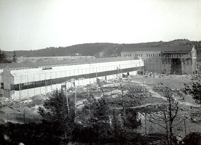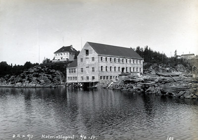 Nitriden. Materiallager i underetasjen. Kontorer i gavlsiden, laboratorium og konferanserom i sidebygningen. Høyre del av bygningen mekanisk verksted i 1. etasje, snekkerverksted i 2. etasje. Til venstre på høyden direktørbolig. Til høyre sees høydebassenget. Foto: Løvfold, 6.6.1914. Stort bilde