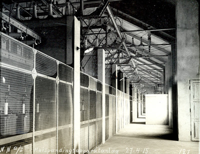 Nitriden. Ovnshus II. Ovner for smelting av aluminium. Skinnegang i mellom ovnene. Foto: Løvfold, 27.4.1915. Stort bilde