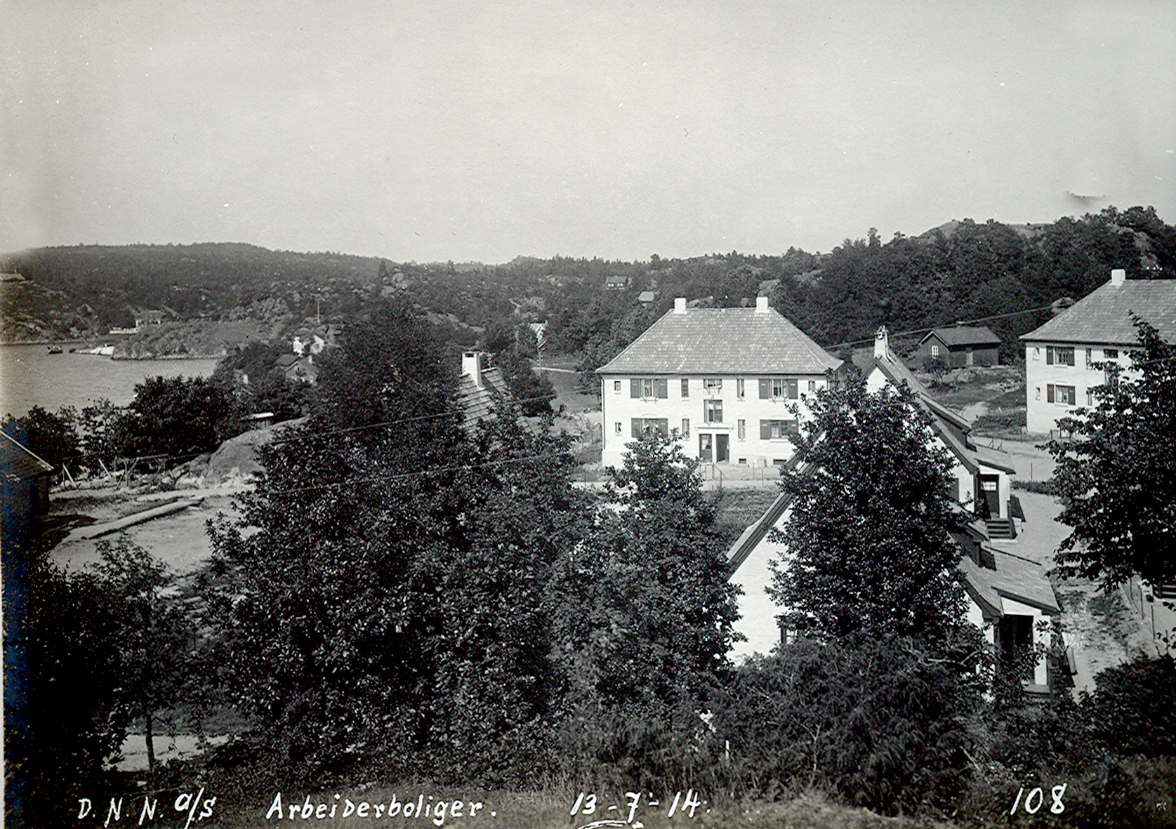 Eydehavn, Nesgaten. Arbeiderboliger. Gaten er anlagt. Det er bygd seks firemannsboliger og fem tomannsboliger. Senere (1916-17) ble bygd to firemannsboliger ti1. Firemannsboligen til venstre brant og ikke bygd opp igjen. Lekeplass i dag. Neskilen sees og småbr uket midt på bildet i bakgrunnen er Kastet. Foto: Løvfold, 13.7.1914. Stort bilde
