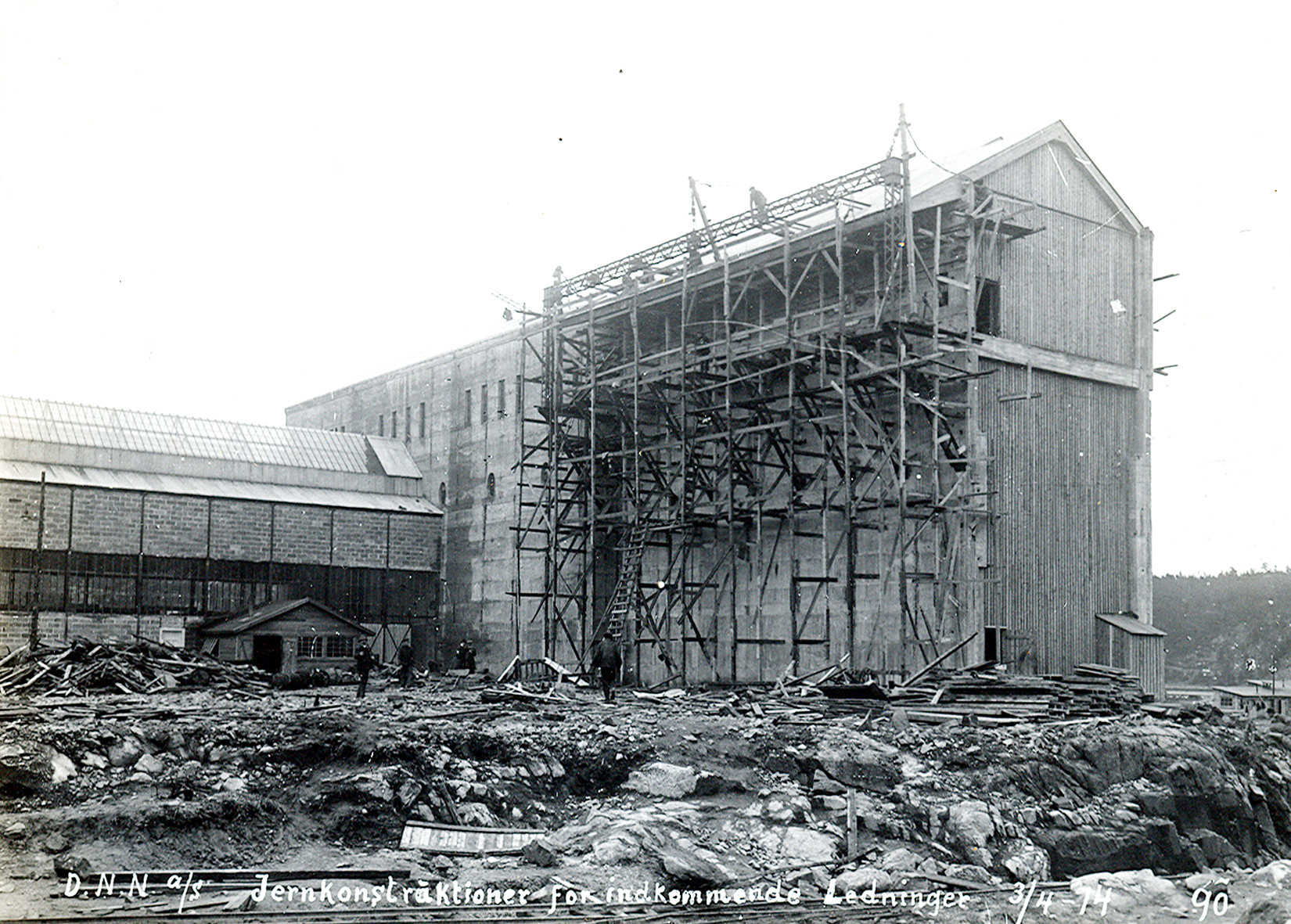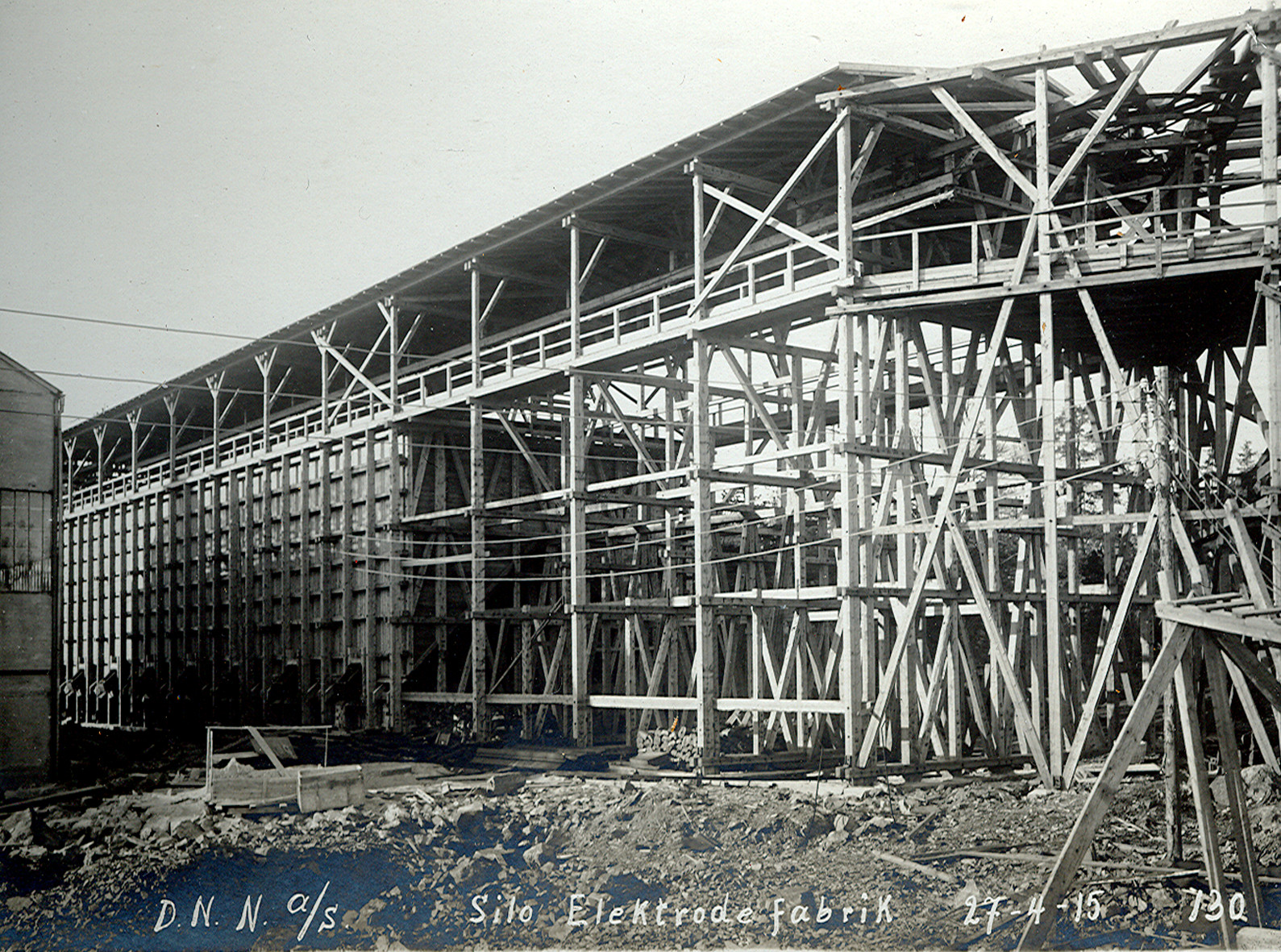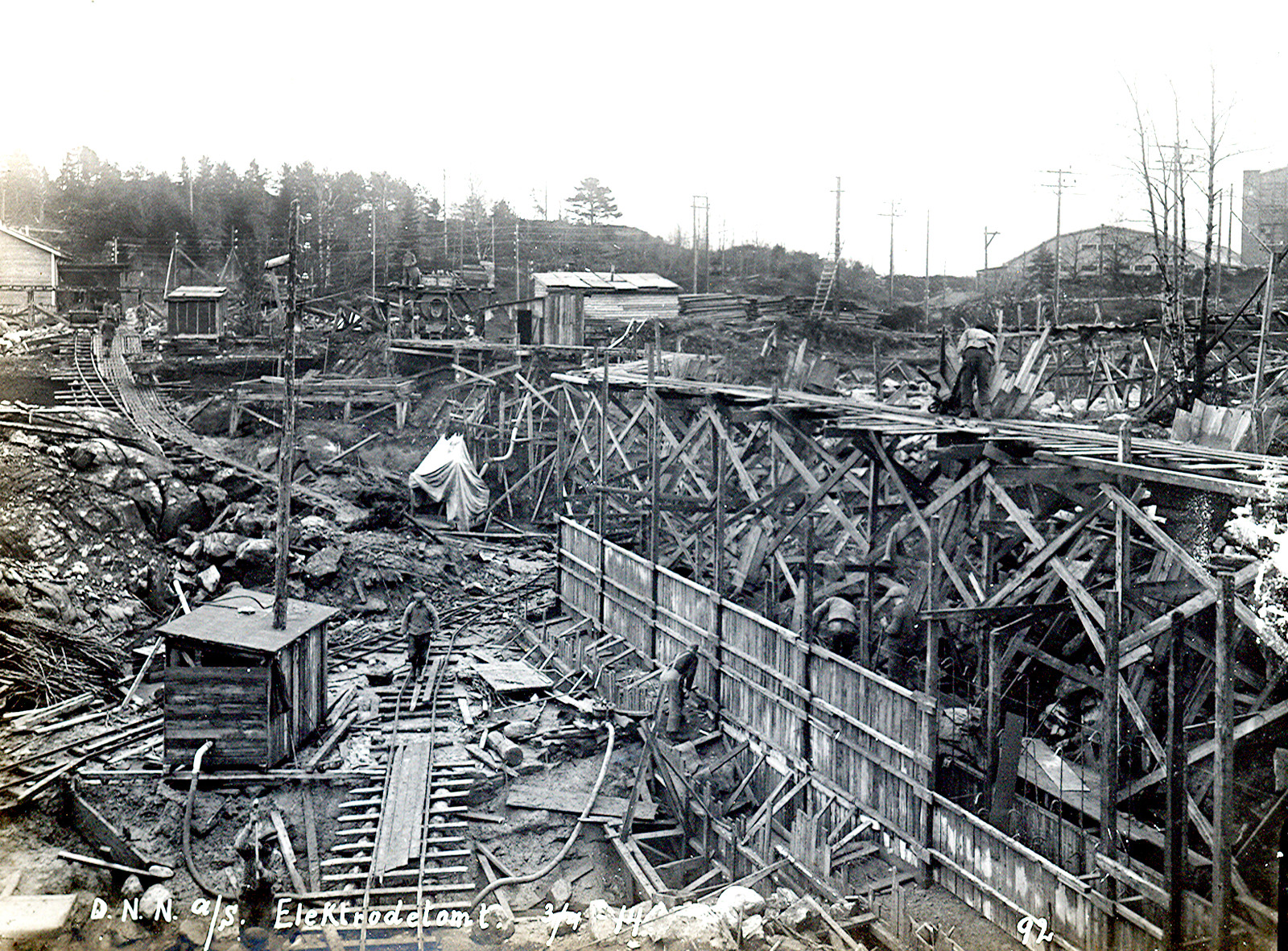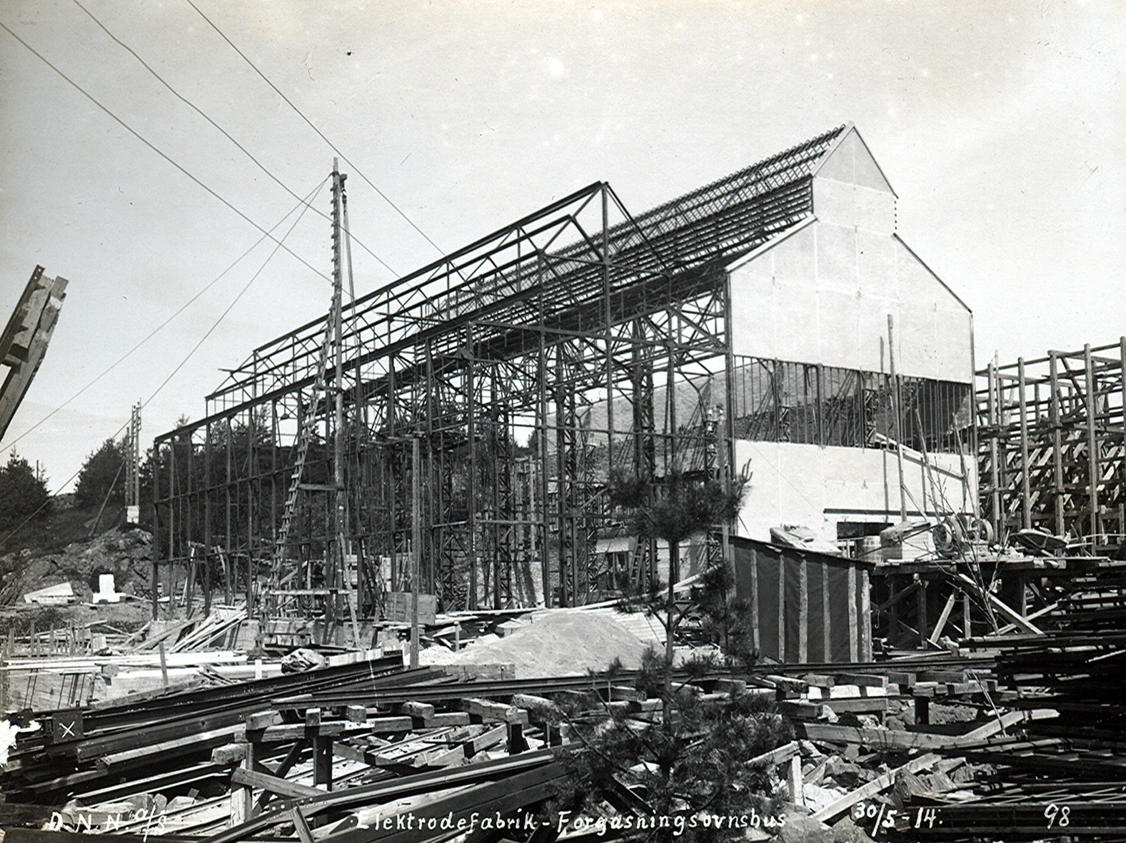 Nitriden. Elektrodefabrikken. Grunnarbeider, fundamentering, Forskaling og støping. Jernkonstruksjoner for bygning. I bakgrunnen til venstre Arendal Smelteverk. På høyden til høyre bolighus (”åttekanten”), Elly Eydes vei 5. Helt til høyre Hotell Solvang under oppfinnelse. Herrene Olav T. Neset og John T. Buen hugde tømmer i Froland, skar tømmeret der, fraktet materialene til Arendal med tog, og til Eydehavn med båt. Derfra med hest og kjerre til byggeplassen. Foto: Løvfold, 3.4.1914. Stort bilde