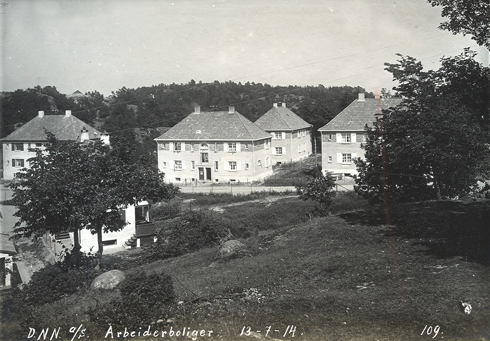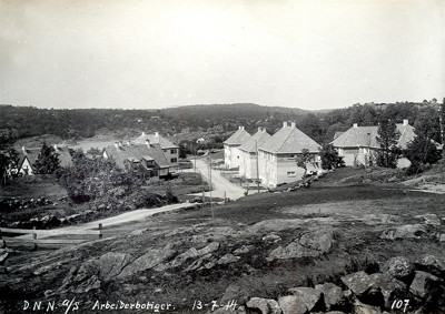Eydehavn, Nesgaten, arbeiderboliger. Boligen til høyre er senere bygd sammen med en annen bygning og danner Eydehavn Kulurhus. Eydehavn torg til høyre utenfor bilderammen. På høydedraget til venstre sees trykkbasseng for vanntilførsel til arbeiderboligene (den lille bygningen med spisst, pyramide-tak). Foto: Løvfold, 13.7.1914. Stort bilde