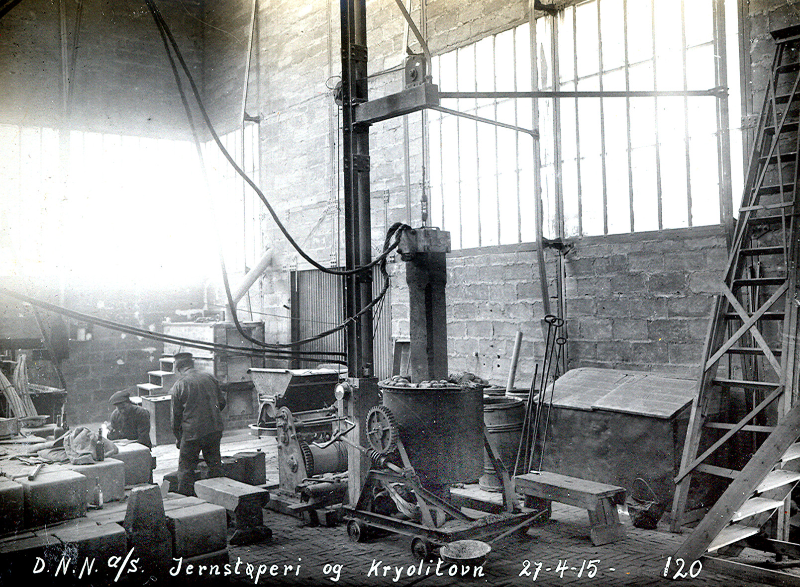 Nitriden. Jemstøperi og kryolitovn. Foto: Løvfold, 27.4.1915. Stort bilde