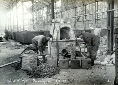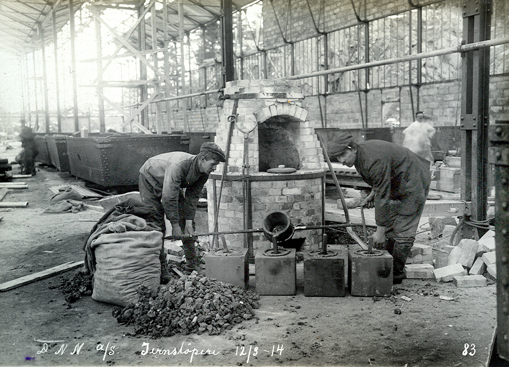 Nitriden. Ovnshus. Jernstøperi. Feste støpes i elektrodekull. I bakgrunnen smelteovner. Foto: Løvfold, 12.3.1914. Stort bilde