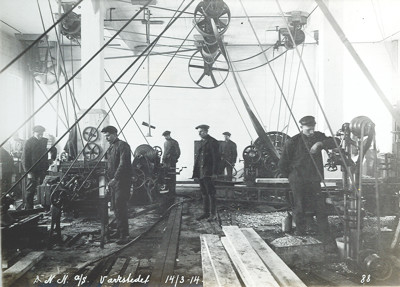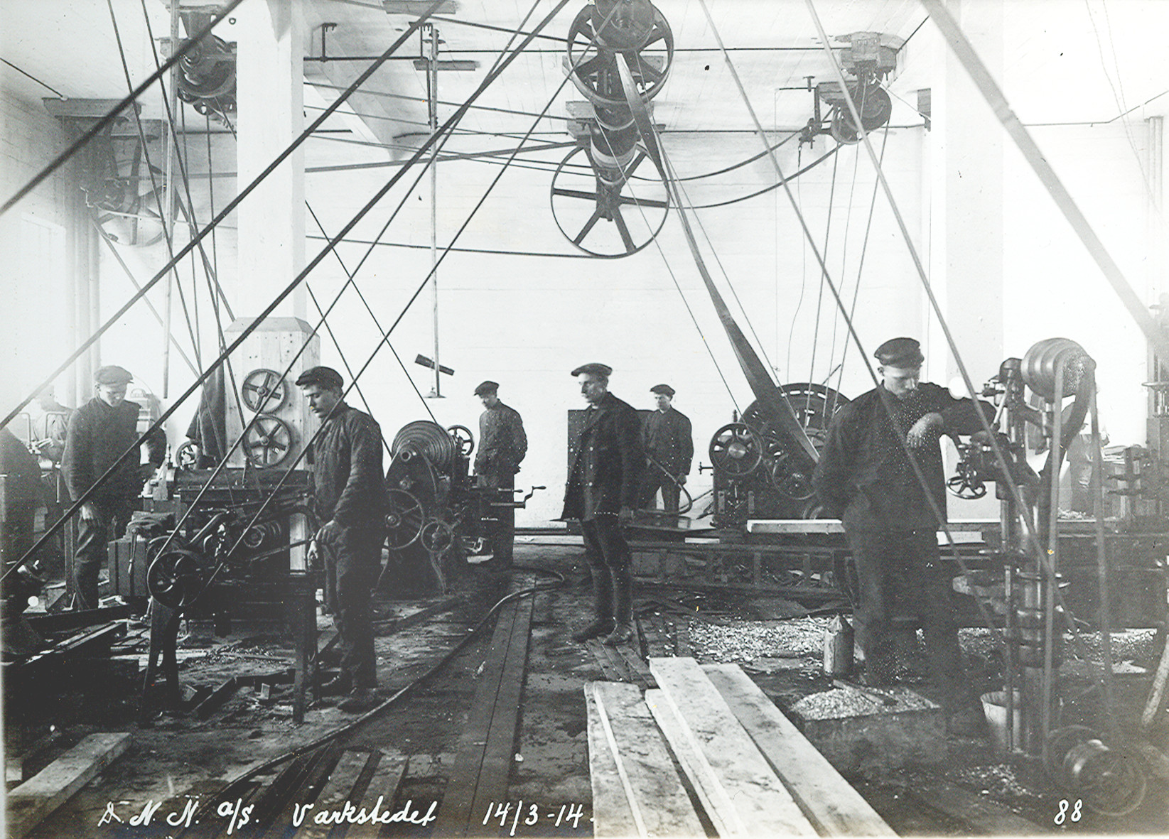 Nitriden. Mekanisk verksted med transmisjonsaksel i taket drevet av hovedmotor. Ubeskyttede removerføringer til de enkelte maskiner. Foto: Løvfold, 14.3.1914. Stort bilde