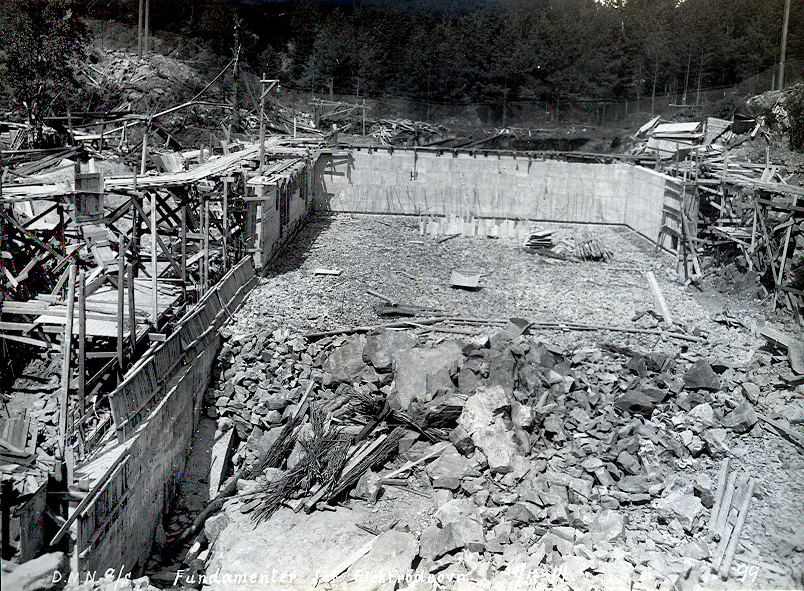 Nidriden. Elektrodefabrikken. Fundament for forgasningsovn. Foto: Løvfold, 6.6.1914. Stort bilde