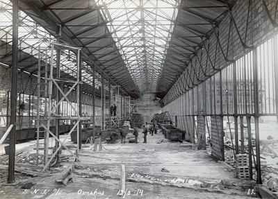Nitriden. Stålkonstruksjoner og murvegger i Ovnshus. Trillebår av tre med jernhjul foran til venstre. Omformerstasjonen delvis skjult i bakgrunnen. Foto: Løvfold, 12.3.1914. Stort bilde