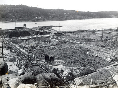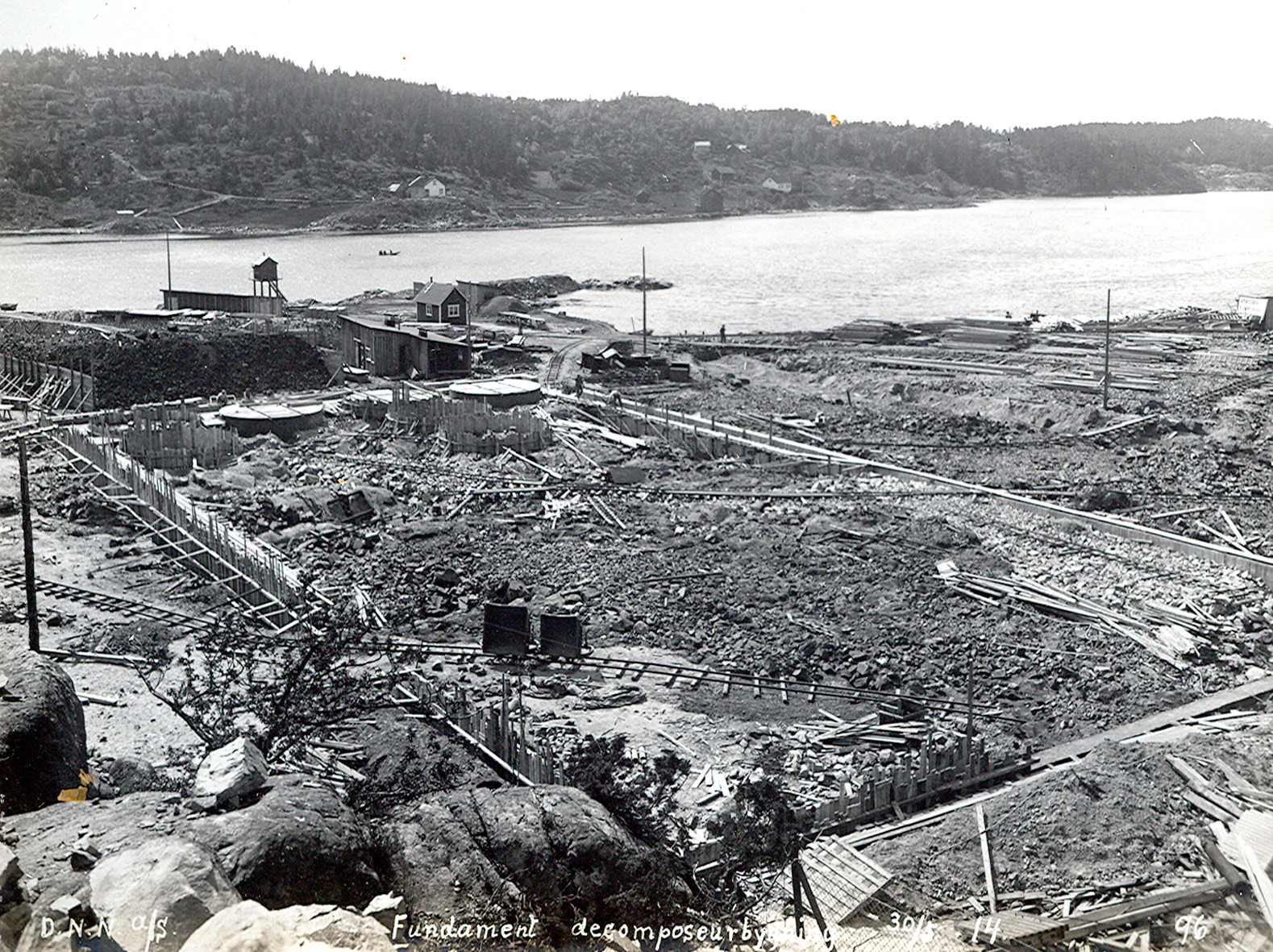 Nitriden. Fundament for decomposeur-bygning. Oppdeling av kjemiske stoffer i prosess avløpsvann. Tromøy og Omdalsøyren i bakgrunnen. Fyrlykt 612, bygd i 1894 og flyttet til Friisøy i 1929. Til venstre, utenfor bildekant, kaianleggene. Foto: Løvfold, 30.5.1914. Stort bilde