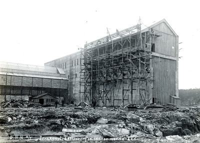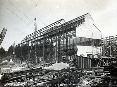 Nitriden. Elektrodefabrikken. Jemkonstruksjoner. Anleggsbrakke i bakgrunnen. Foto: Løvfold, 3.4.1914. Stort bilde