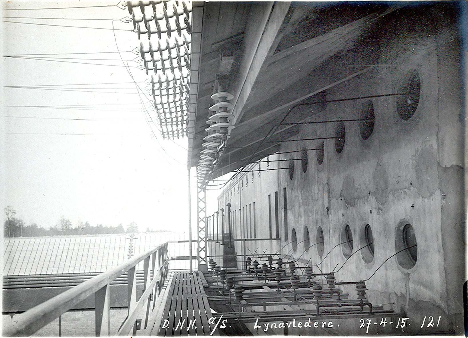 Nitriden. Kraftledningenes inntaksside på omformerstasjonen. Lynavledere. I bakgrunnen Ovnhsus I. Foto: Løvfold, 27.4.1915. Stort bilde