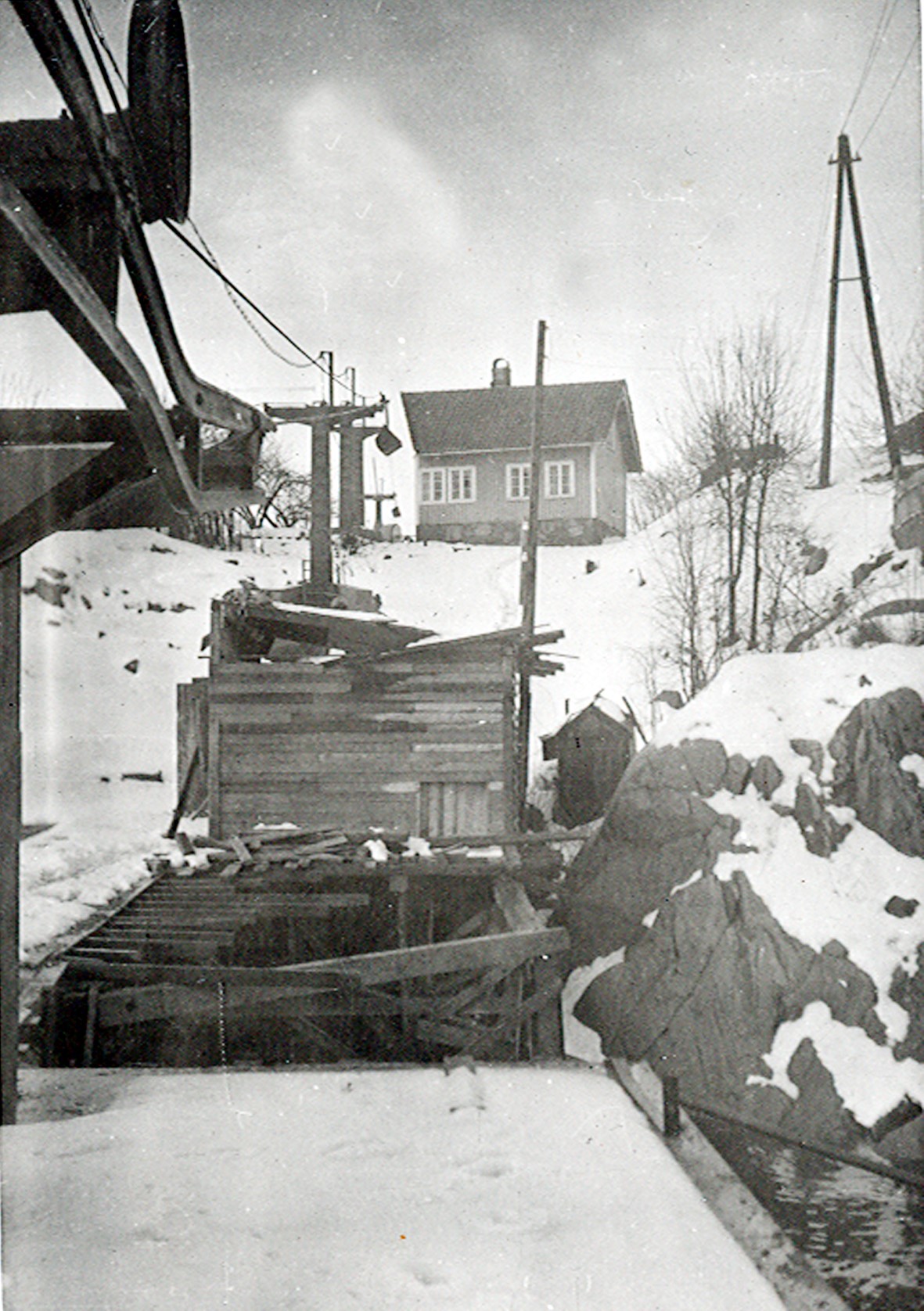 Smelteverket. Taubane fra importkai ved Tromøysund. Huset (bygd 1860, revet 19??), var eid av Aaste Knudsen for 1912. Leieboere senere Tyra og Per Andersson . Merk: Hjørnet på huset måtte kuttes da taubanen kom. Foto: Ukjent. Stort bilde