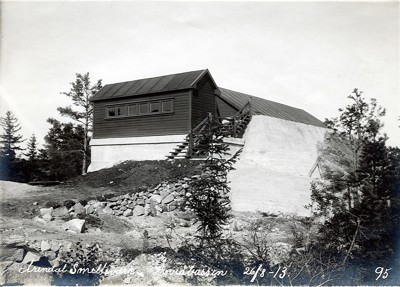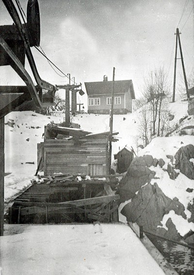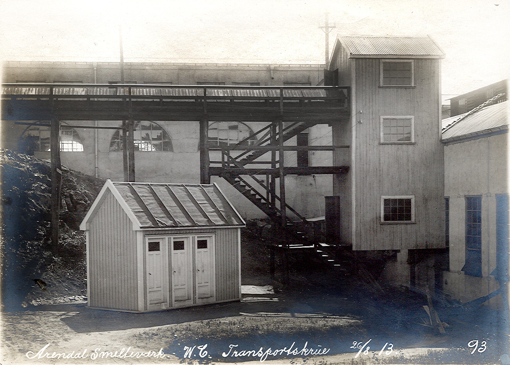 Smelteverket. Transportskrue for masser. Ovnshus II i bakgrunnen, til høyre Ovnshus I. Huset med tre dører må være WC? Foto: Løvfold, 1913. Stort bilde