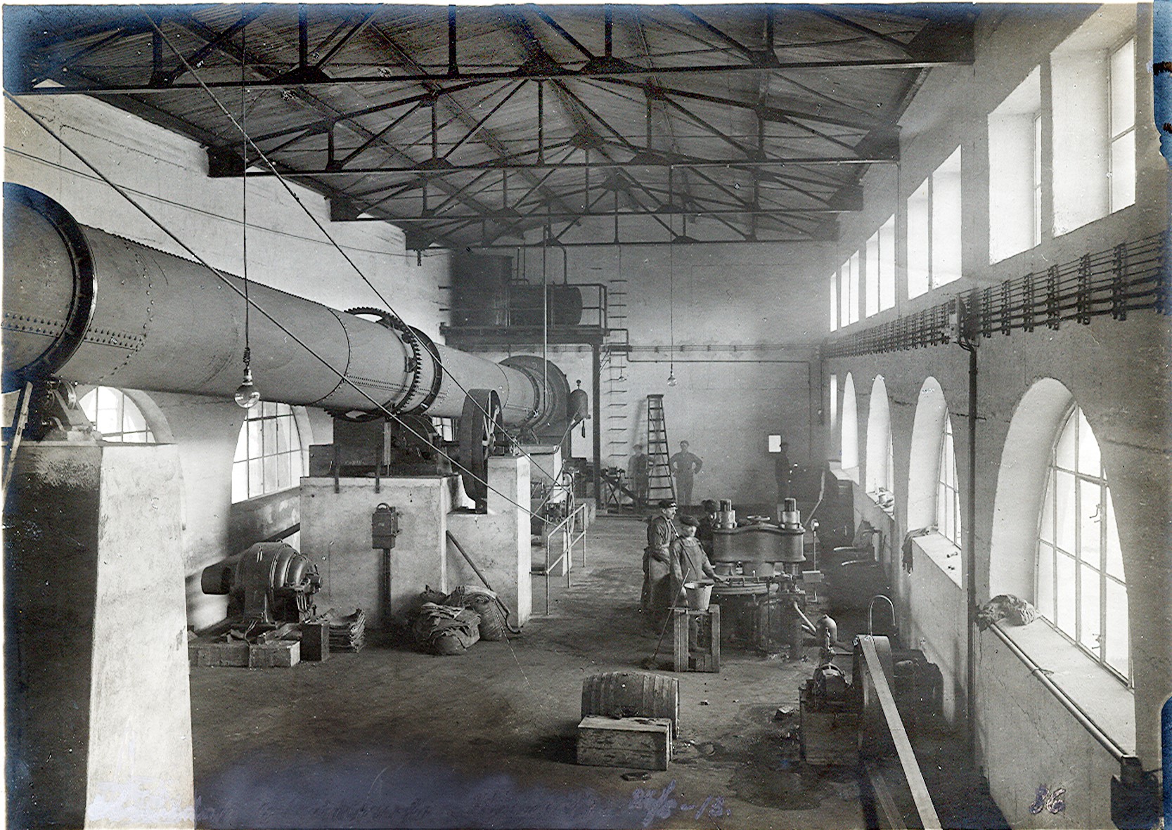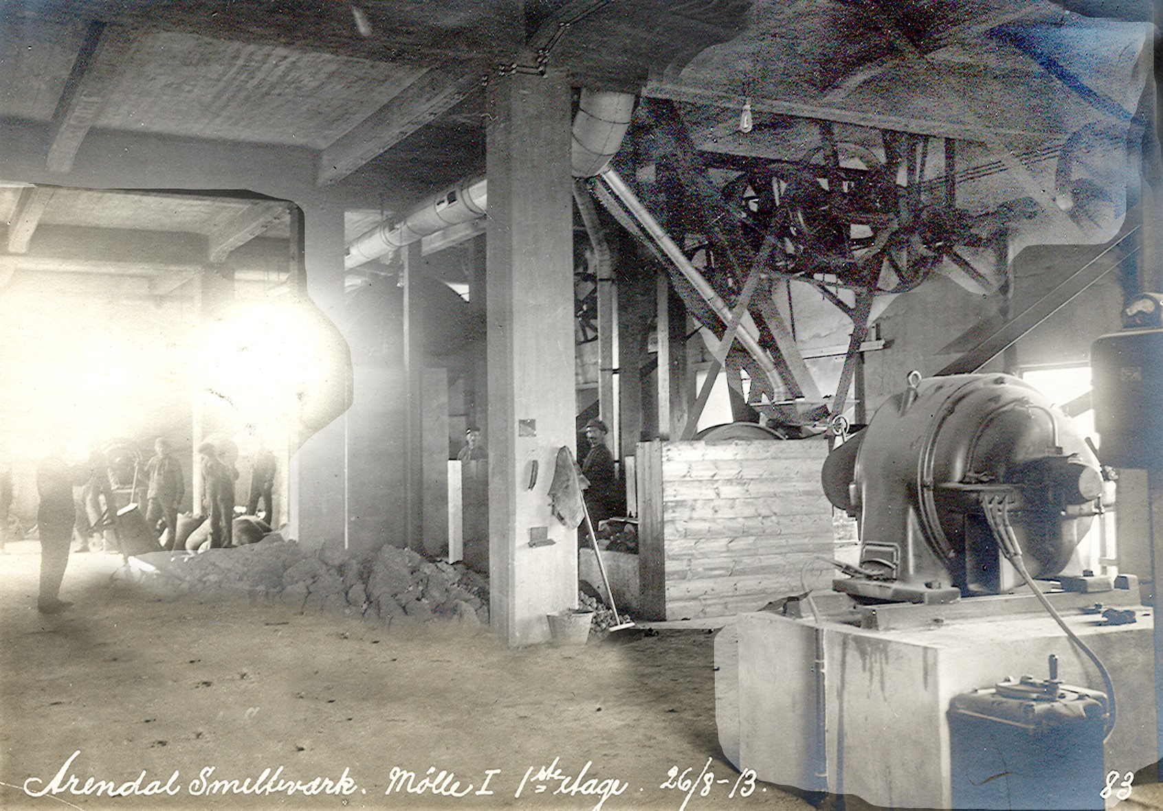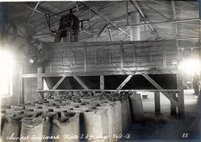 Smelteverket. Mølle I, 1. etasje. Produksjonsutstyr. Foto: Løvfold, 1913. Stort bilde