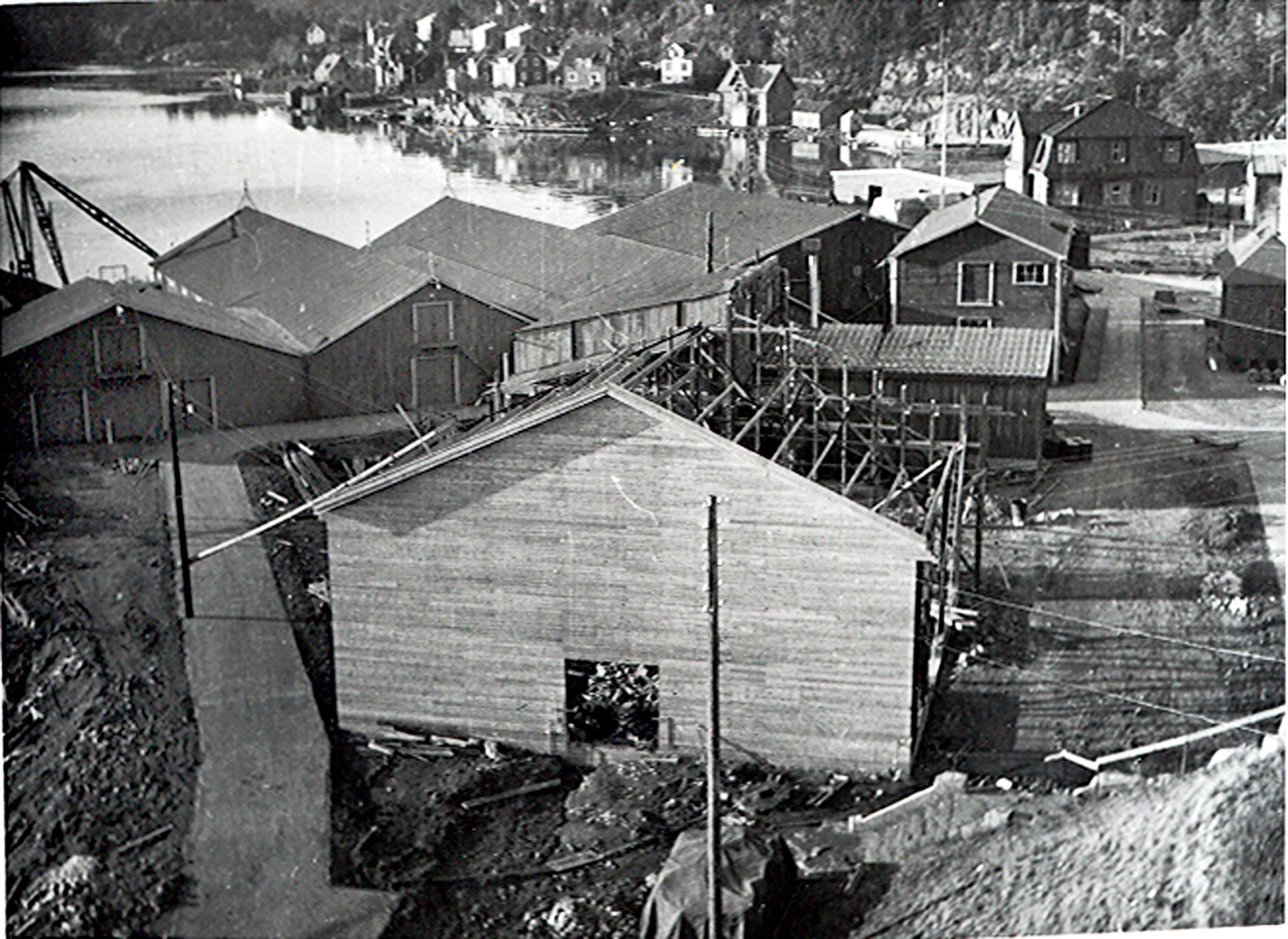 Smelteverket. Kulemøllehus bygges. Til venstre kran på kai. Lagerskur. Materialforvalterens lager og elektroverksted. Kontorbygningen. I bakgrunnen Stranda (Nils Hjelmtveits vei). Med boliger eid bade av Smelteverket og private boliger. Like til venstre for kontorbygningen sees "Kommunebrygga". Østre Hellesund. I det fjerne den gamle "ferjeplassen" over til Neskilen. Foto: Ukjent, 1947. Stort bilde