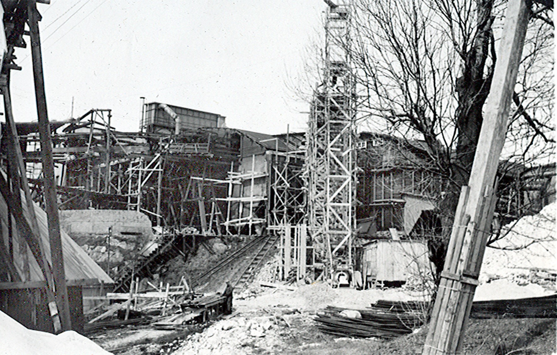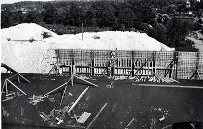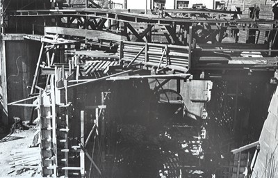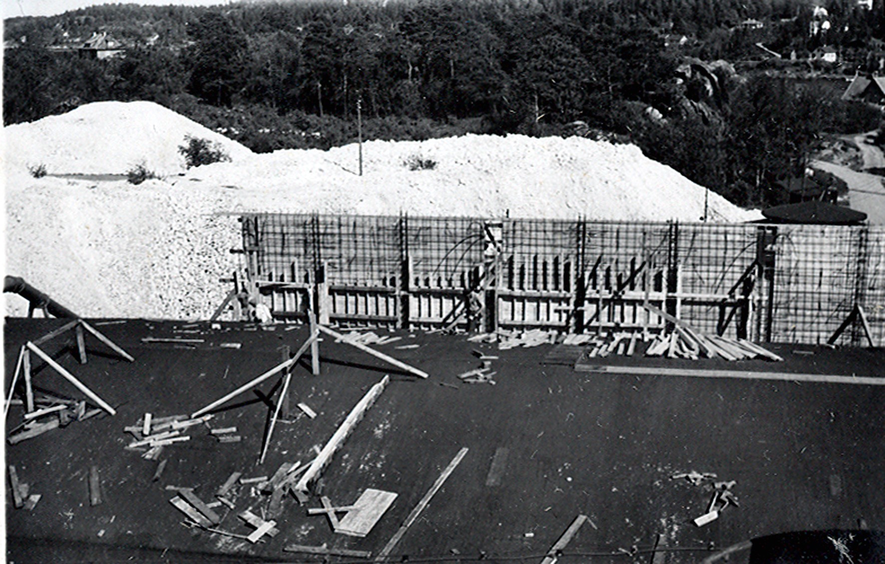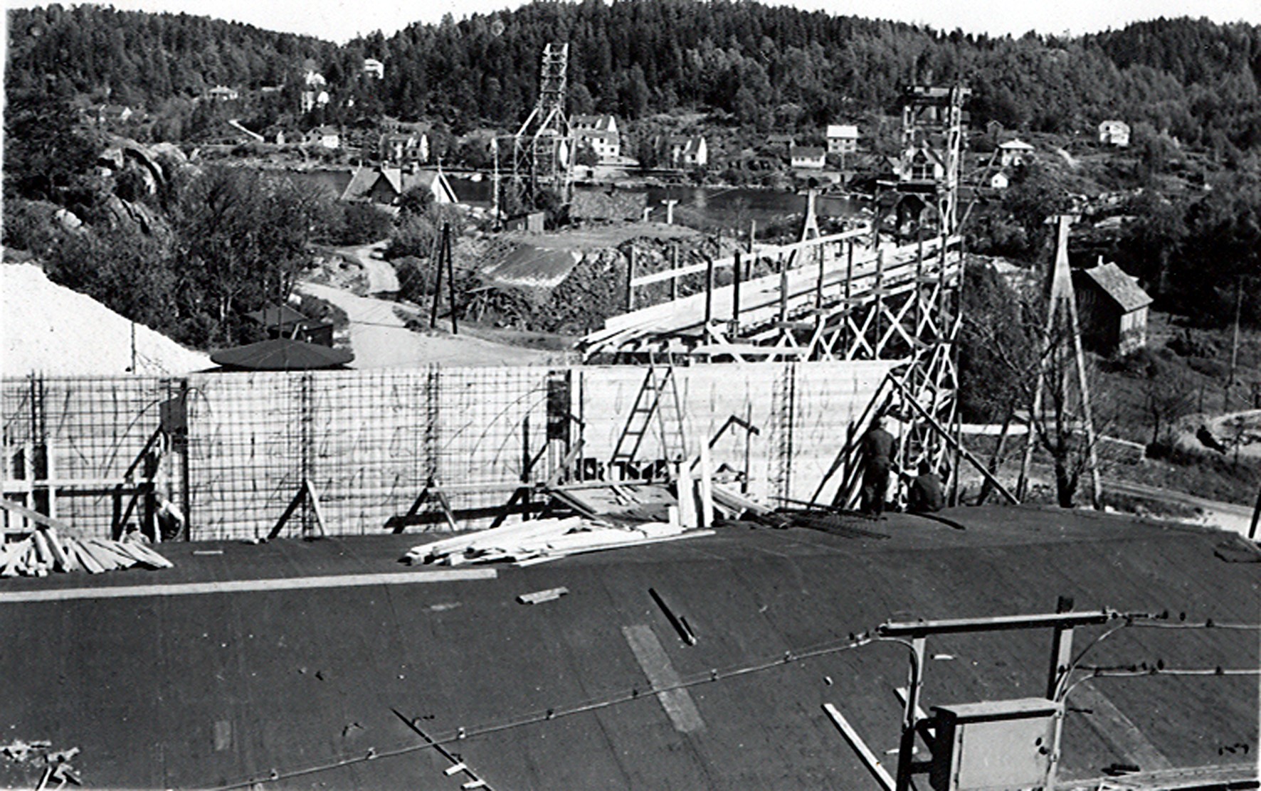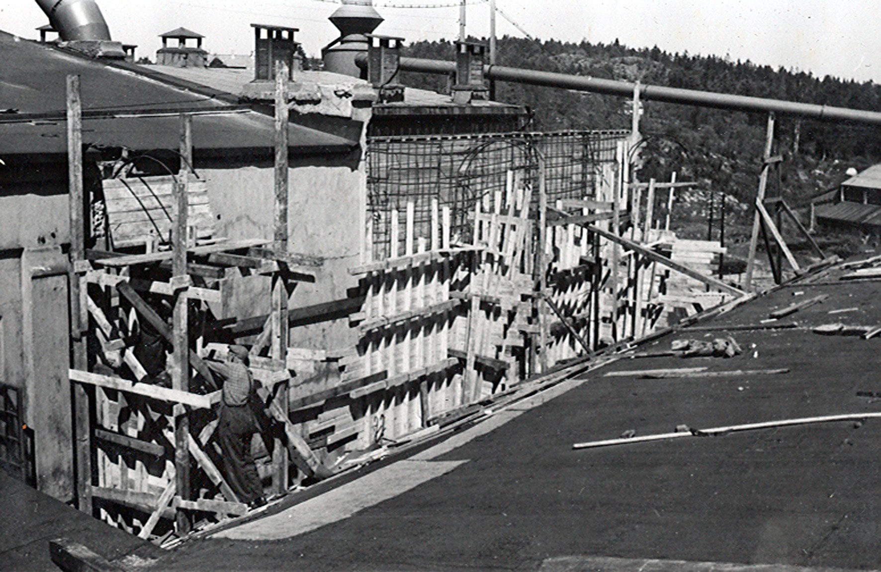 Smelteverket. Ombygging taubane/silo. Foran taubane. Bakenfor forskalinger. Foto: Thorleif Wimme, 1956. Stort bilde