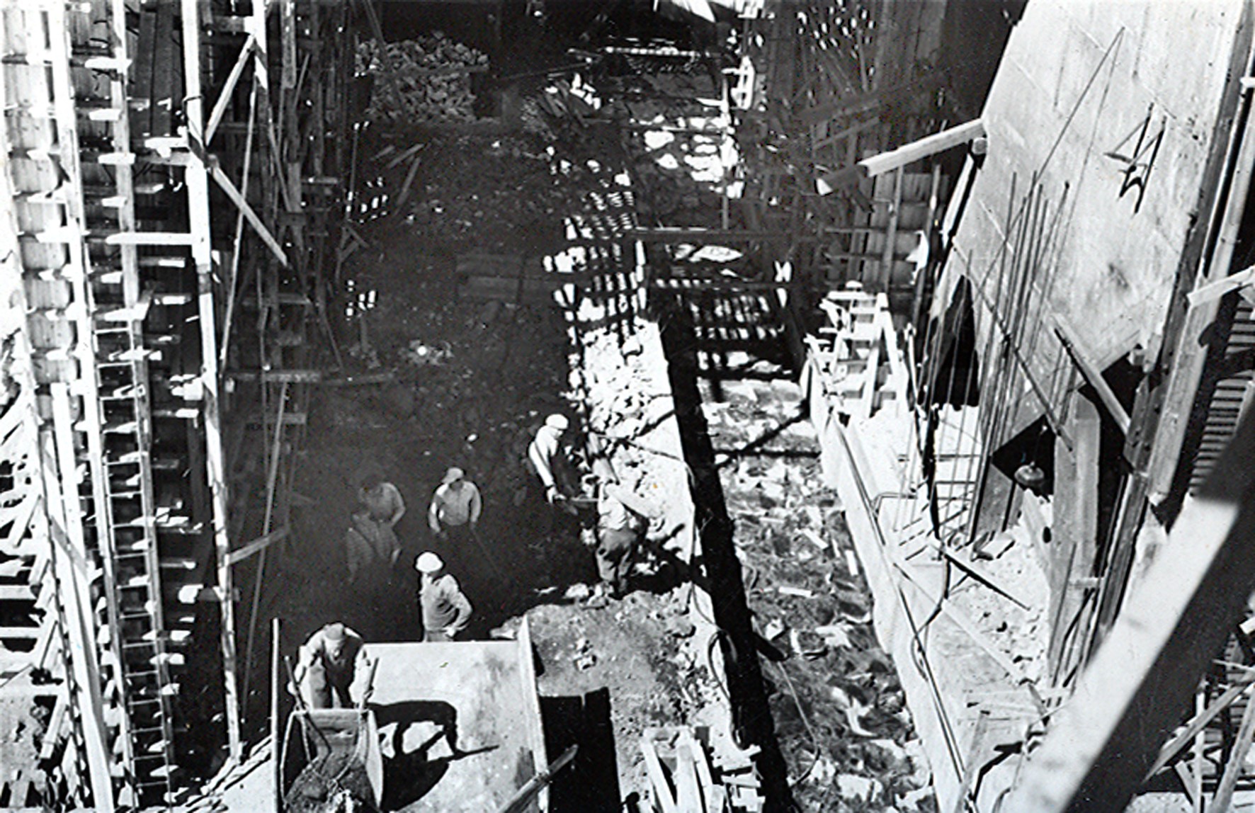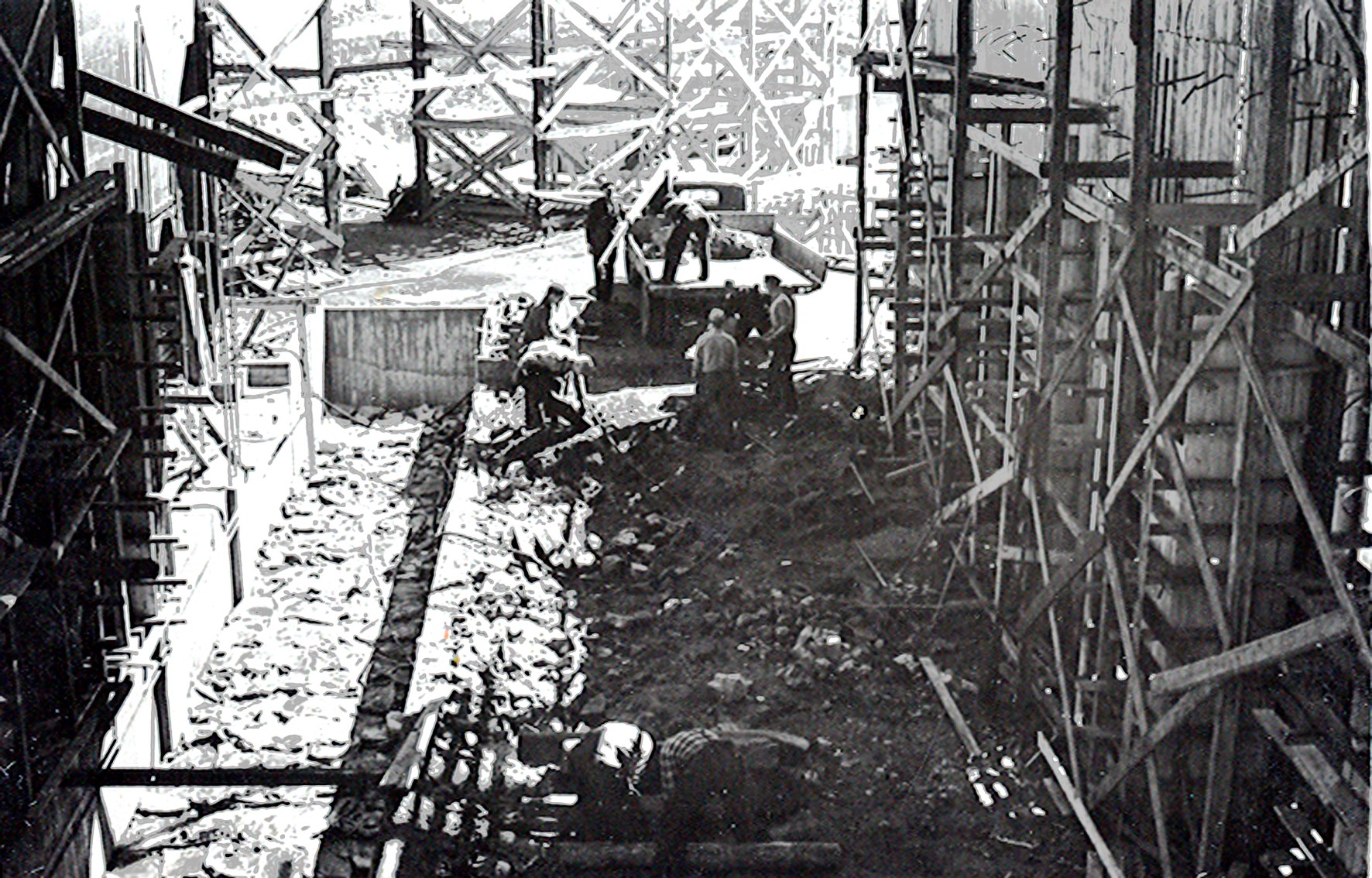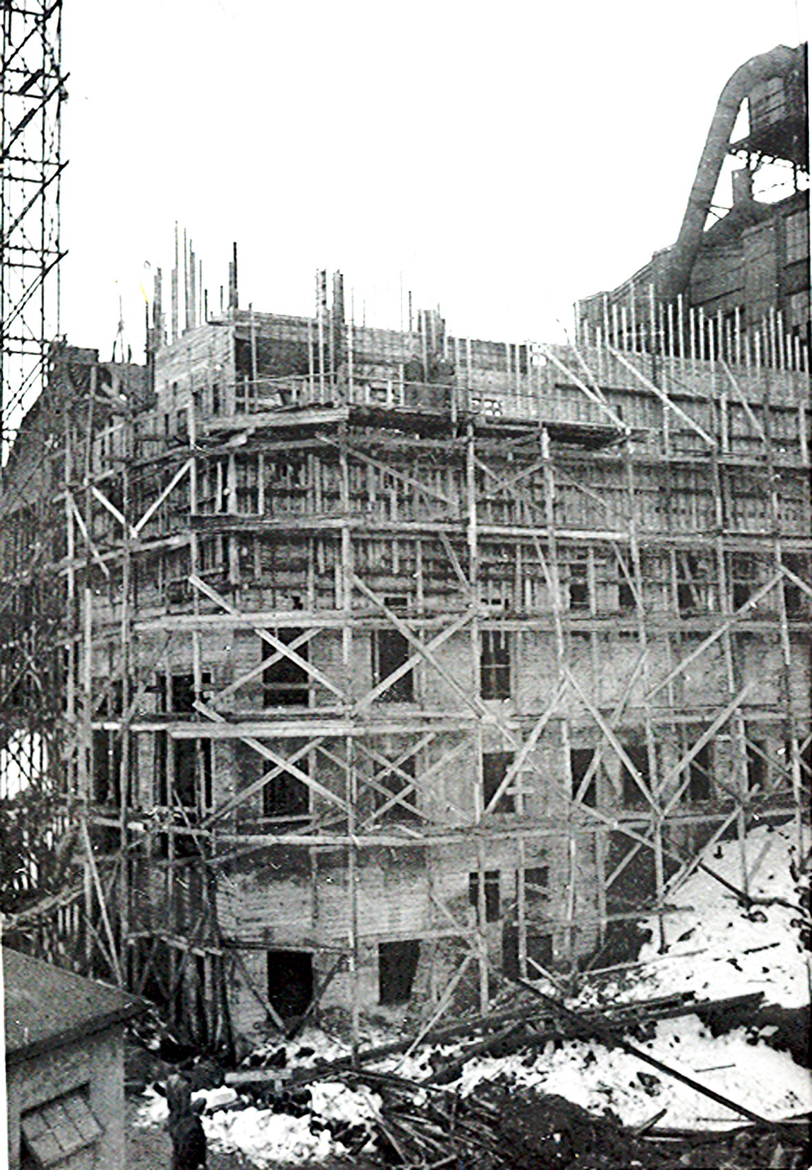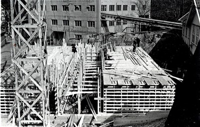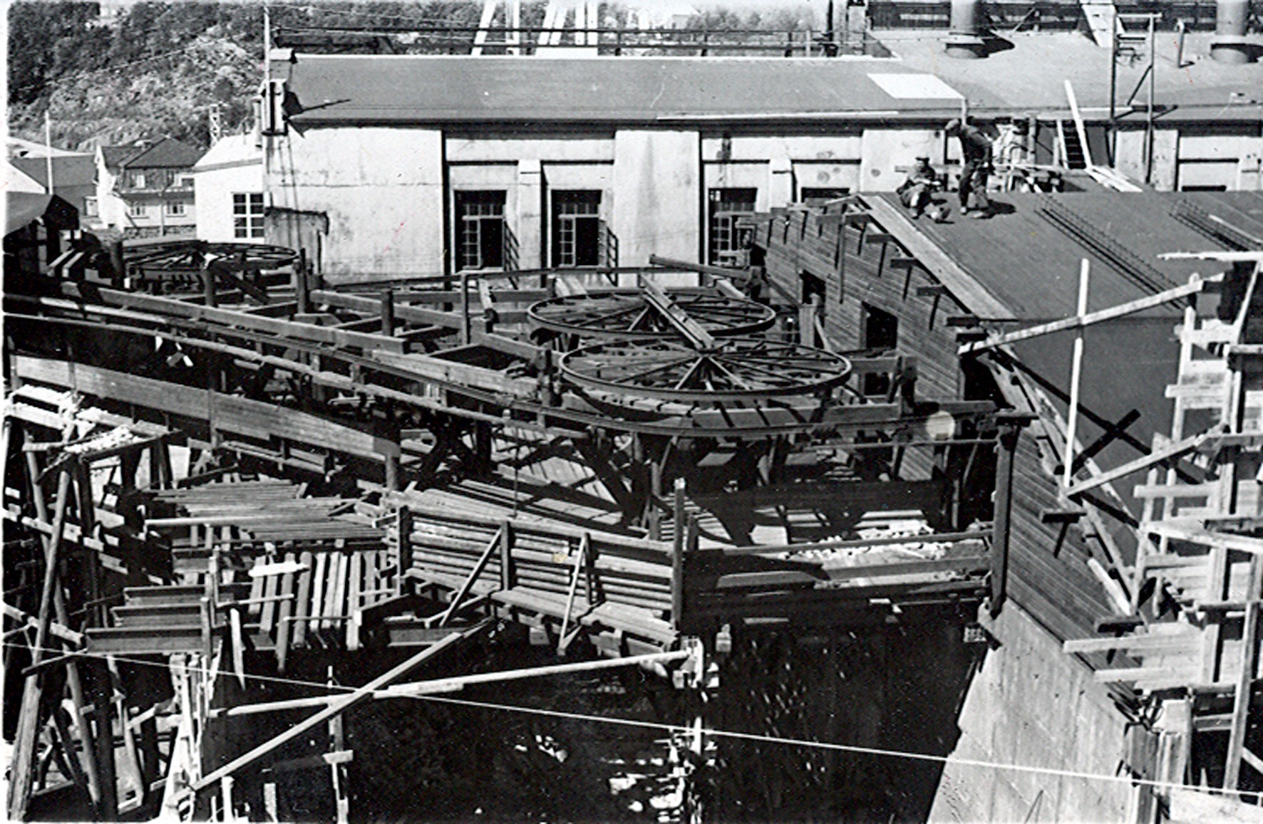 Smelteverket. Ombygging taubane/silo. Foran taubane. Bakenfor forskalinger. Foto: Thorleif Wimme, 1956. Stort bilde