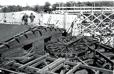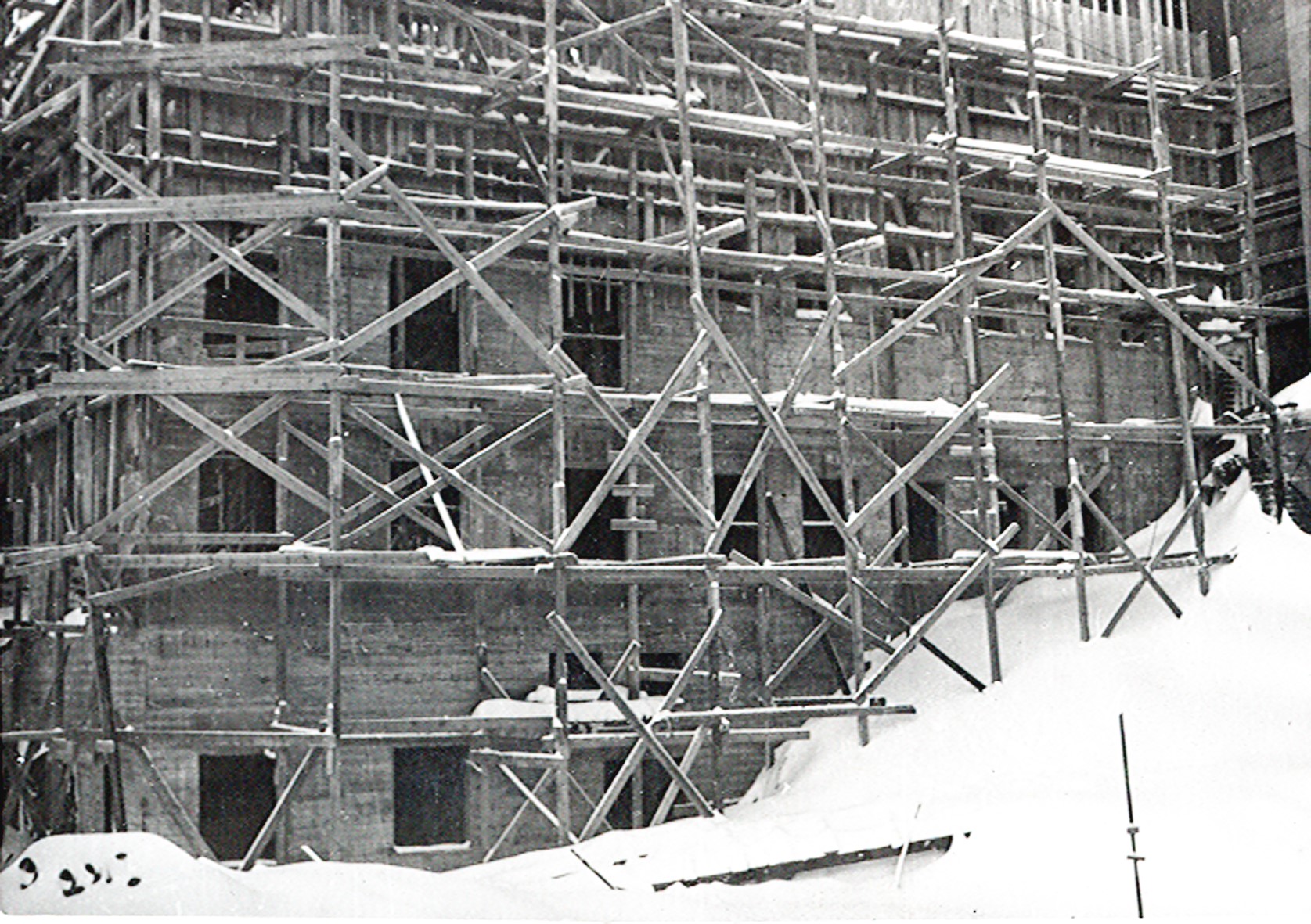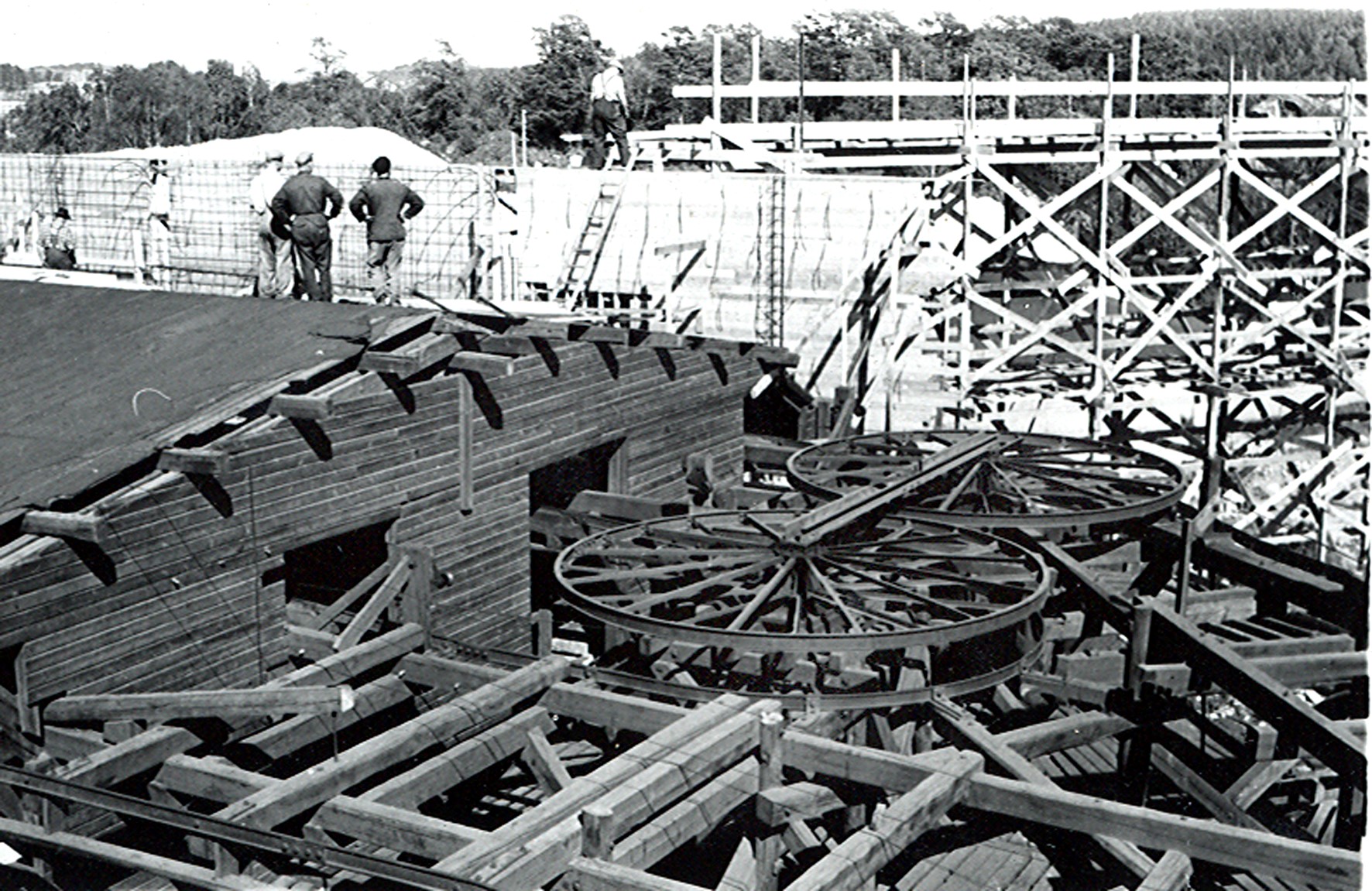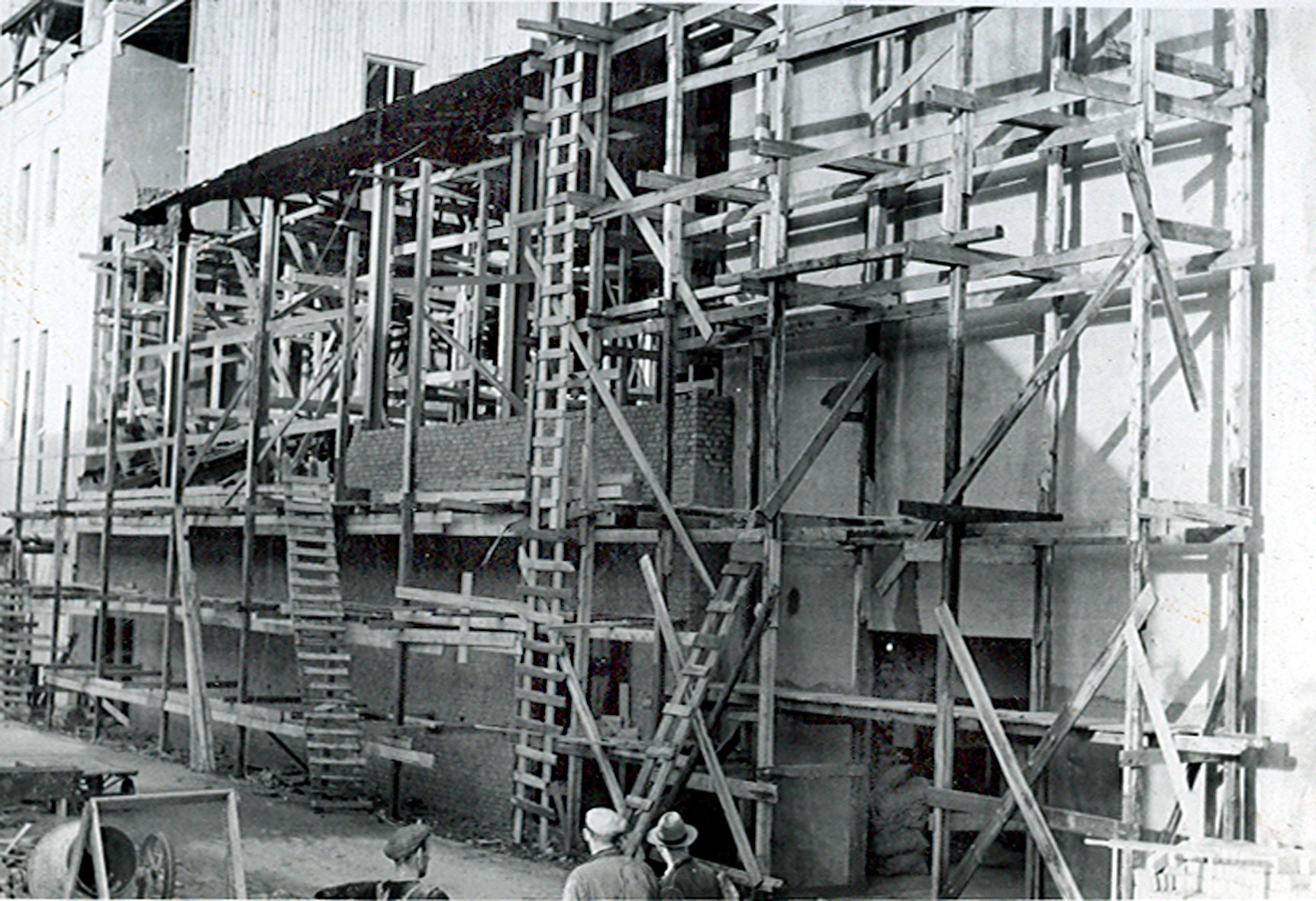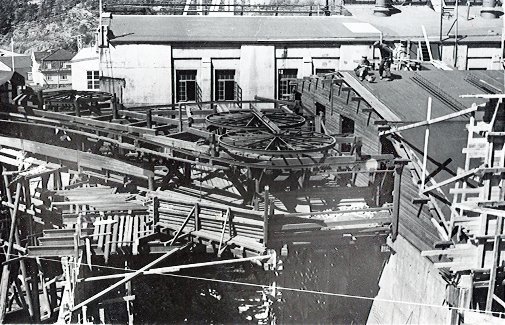 Smelteverket. Ombygging taubane/silo. Foran taubane. Bakenfor forskalinger. Foto: Thorleif Wimme, 1956. Stort bilde