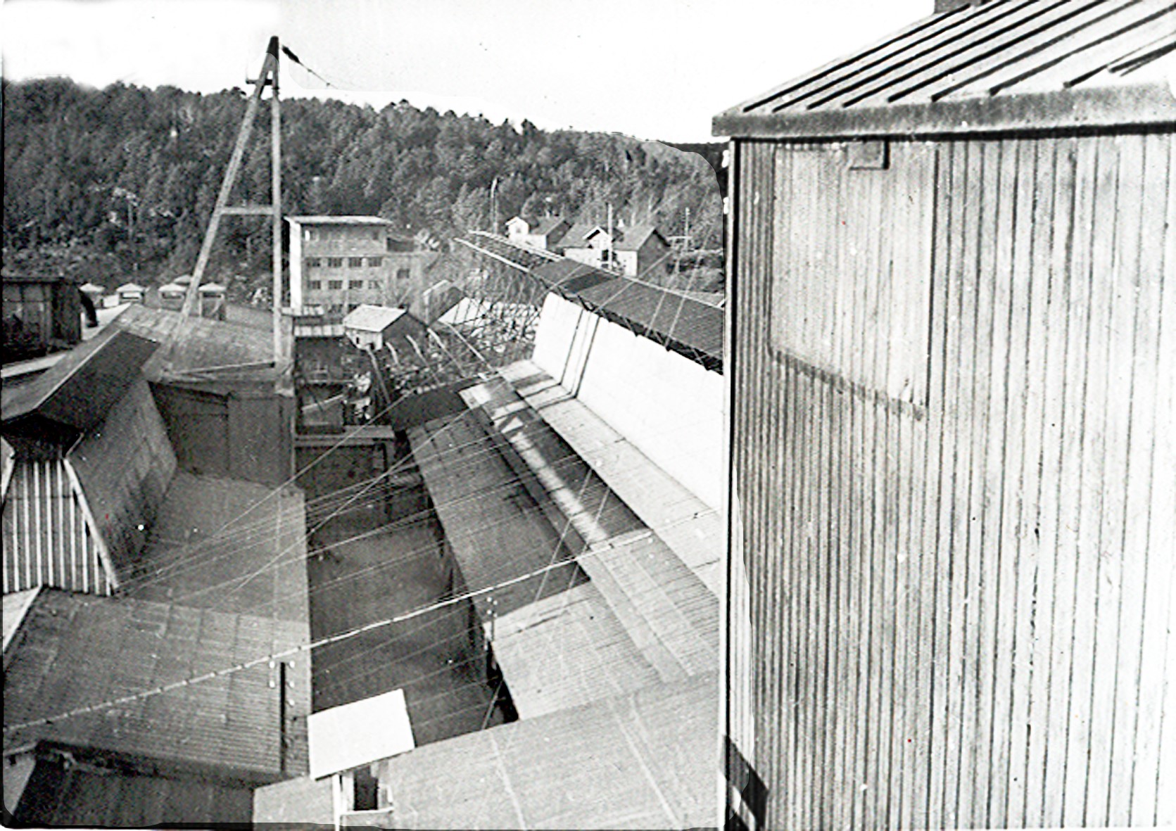 Smelteverket. Rå-SIKA-siloer under bygging. Til venstre Mølle II. I bakgrunnen Taubane/silotopp. Krans på taket. Til høyre Slemmeanlegg -51. Midt på bildet slemmekar/lagringskar. Pumpeledning for vannbårent stoff. Foto: Thorleif Wimme, 1954. Stort bilde