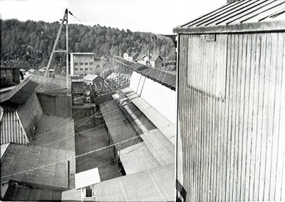 Smelteverket. Forlengelse av Ovnshus A. Gammelmasseanlegg i bakgrunnen. Til høyre Mølle II og gamle"mikroanlegg ". Til venstre sag og snekkerverksted, til høyre optikkhus. Foto: Ukjent. Stort bilde