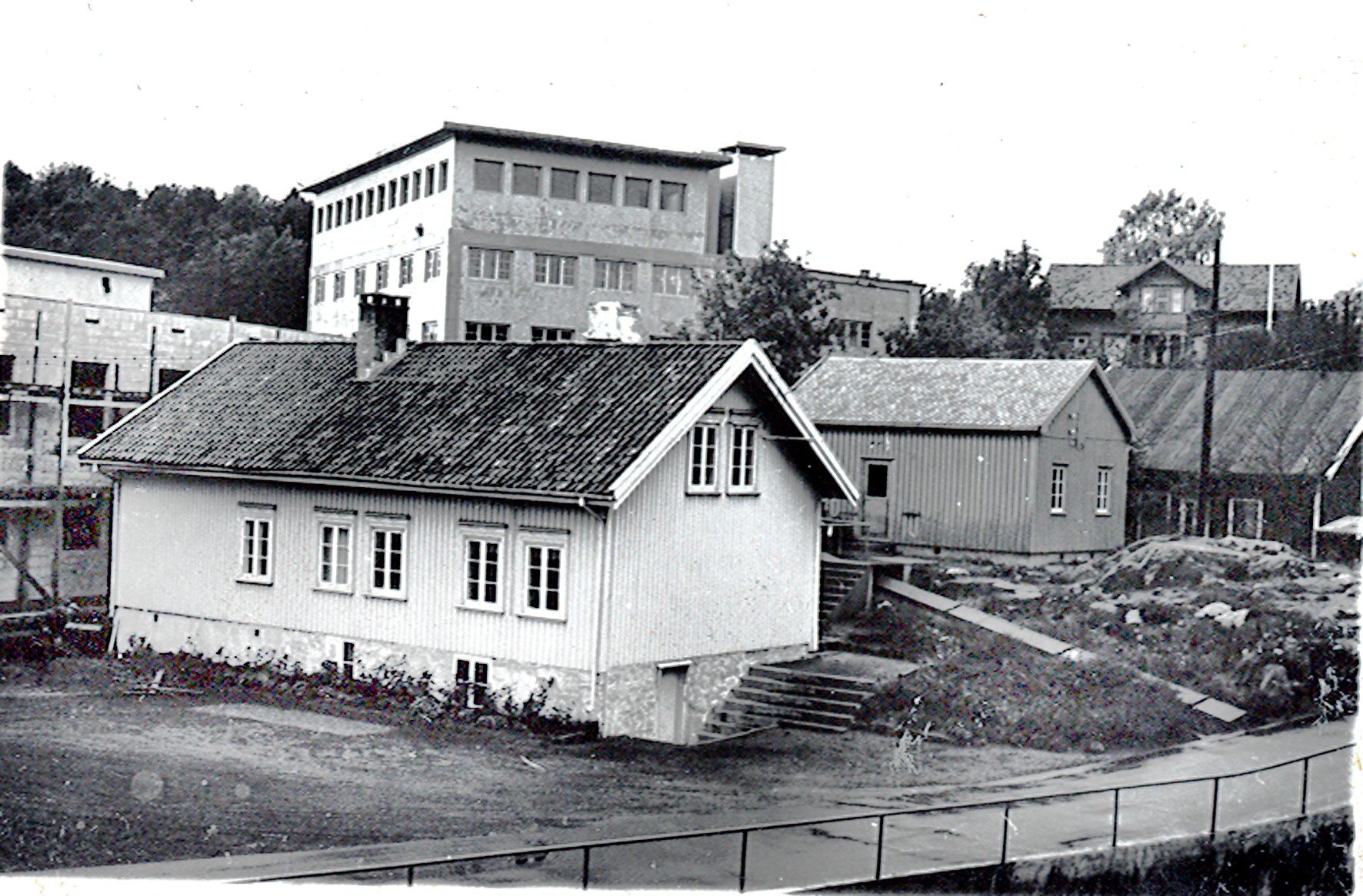 Smelteverket. Fra venstre nytt laboratorium Foran det "gamle" laboratorium. Firevinduers hus, (antatt bygd 1840-1870) eid av Ole Johansen for Smelteverket. Nicolai Jacobsen bodde her noen år. Benyttet som laboratorium. Påbygd mellom 1936-1940. Revet 1956. Mikroanlegget i bakgrunnen. Optikkhuset, fotolaboratorium, mikroskopiundersøkelse av produktet etc., til høyre. Antatt bygd 1936-1947. Revet 1961-1968. Helt til høyre "Saga", bygd 1913-1921, revet 1947. Fra saga var anordnet kjerrat fra sjøen. Østre del revet for 1953. Tollvesenet hadde rom her, og senere kom det første legekontor her. Pa høyden til høyre "Messen". Verksmester Ewald Hoxmark bodde her mange år. Foto: Thorleif Wimme, 1956. Stort bilde